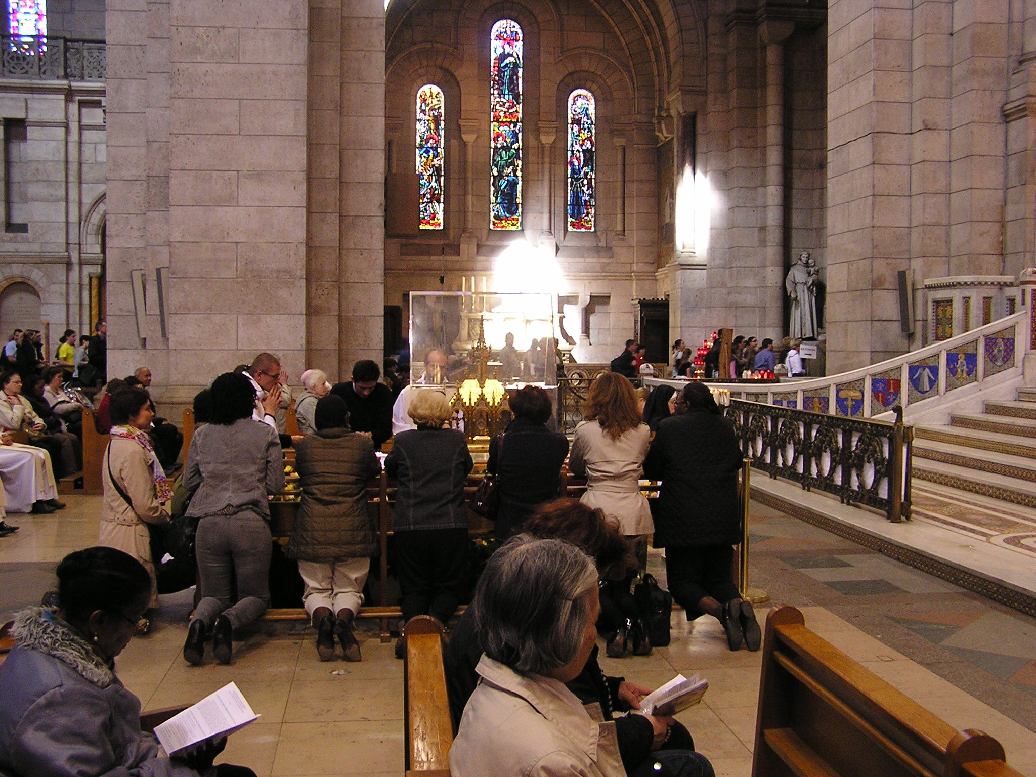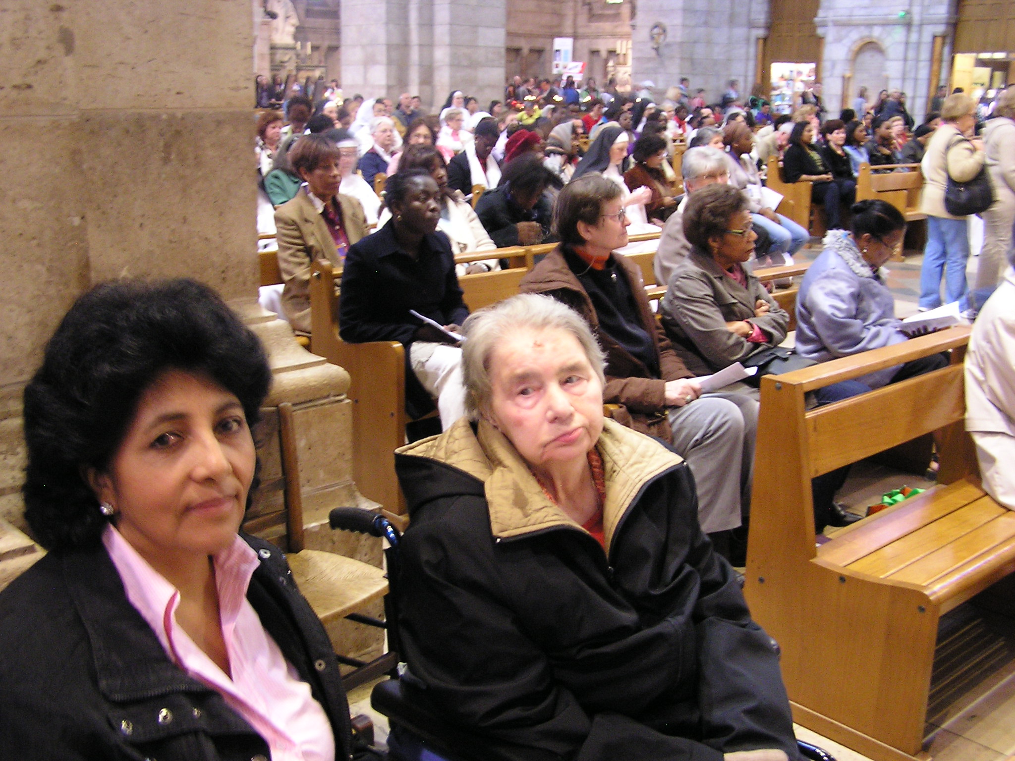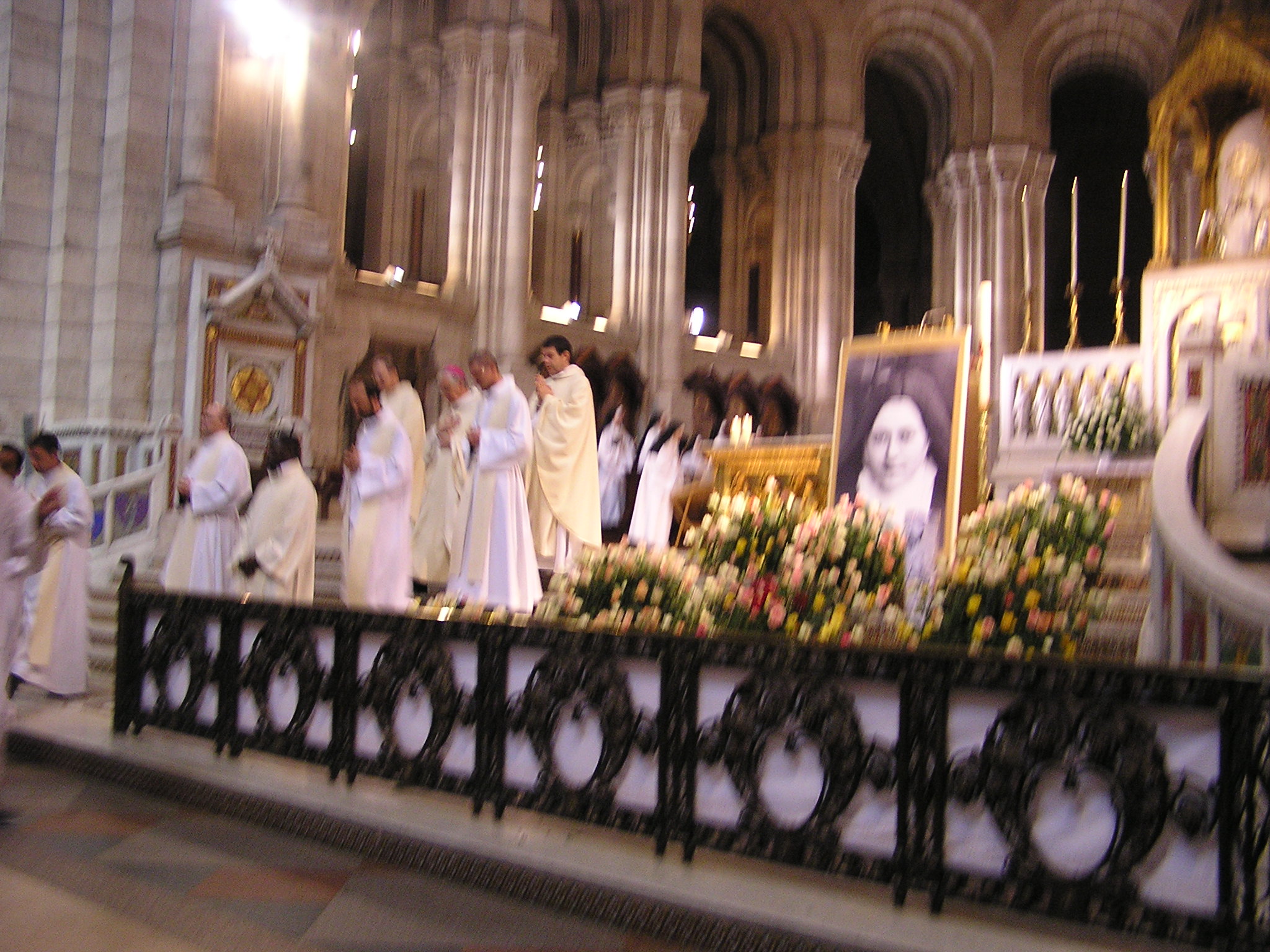 Il complesso della basilica include un giardino per la meditazione. La cupola è aperta ai turisti e offre una spettacolare vista panoramica della città, che si estende a sud della basilica.All’interno di questa basilica ci attende una grande sorpresa: vi è la reliquia di Santa Teresina di Lisieux, di cui abbiamo ripreso in questo diario parte di una sua bella poesia. Santa Teresina, voleva essere il cuore della Chiesa, e il suo corpo ora si trova in questa basilica per alcuni giorni! Sembra voler attendere Santina, che ha dato a Dio il suo cuore nel terribile intervento dell’anno 2005. Entriamo nella grande Basilica che ha come sua caratteristica l’adorazione eucaristica continua notte e giorno. Ci raccogliamo in preghiera e poi ci rechiamo davanti all’urna della Santa di Lisieux, lentamente leggo una sua poesia che diviene per me, Mamma ed Olinda un bella preghiera, riascoltiamola insieme nei suoi passaggi più suggestivi:Nella sera d’amore Gesù, fuor di parabole, disse: Chi vuole amarmi osservi la mia parola fedelmente, ed io e il Padre mio verremo a visitarlo: prenderemo dimora nel suo cuore, ne faremo la nostra reggia, il nostro vivente soggiorno, perché vogliamo ch’egli resti nel nostro amore. Vivere d’amore è custodirti, Verbo increato! Parola del mio Dio! Io t’amo, e tu lo sai, divino Gesù!