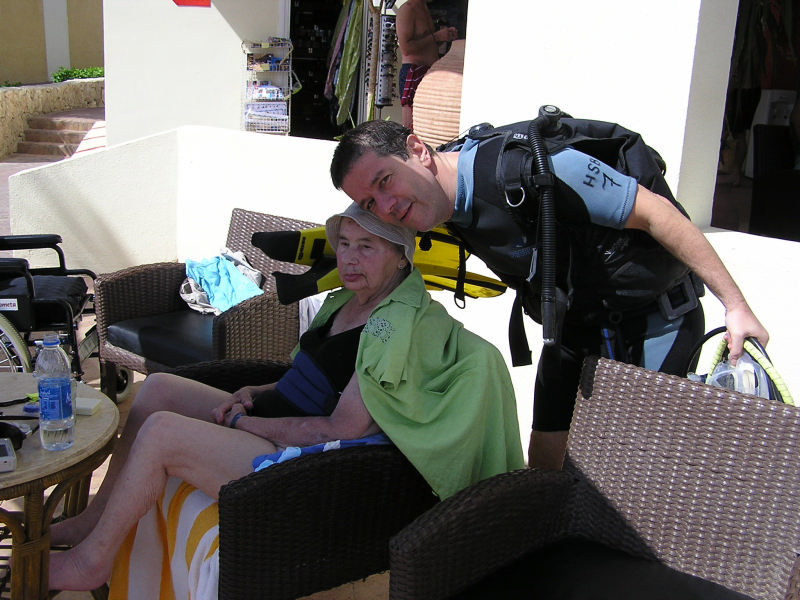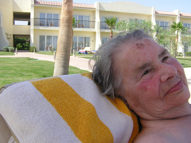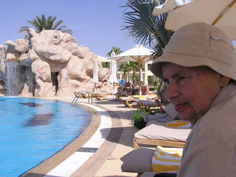 Il nostro albergo Hilton Shark Bay si trova a Sharm el Sheik, direttamente su di una spiaggia privata. Dista 10 minuti dall’aeroporto e 12 chilometri dalla famosa Naama Bay. La nostra vacanza prevedeva la partenza in aereo da Bergamo; forse l’unico punto negativo di tutta la vacanza e forse anche responsabile del malore di Santina è stato il viaggio in aereo nella notte fonda e con una variazione di orario importante. Fortunatamente tutto si è risolto bene. Le nostre giornate al Mar Rosso erano scandite dalla preghiera: preghiera del mattino, Angelus a mezzogiorno, rosario, messa, preghiera della sera. Personalmente poi svolgevo le altre pratiche di pietà: meditazione, breviario, lettura spirituale. Dopo la colazione alle ore 10, ci recavamo al bordo della piscina dove mettevamo Santina a prendere un po’ di sole, non è il sole forte e bruciante di agosto, ma quel dolce tepore di novembre. Dopo un paio di ore a bordo piscina, durante le quali mettevamo mamma con le sue gambe nell’acqua verso mezzogiorno tornavamo in camera e Olinda cambiava Mamma per il pranzo.