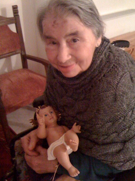 Santina dimostra di avere ancora una memoria, dimostra di avere una indomita e ciclopica forza di volontà che la spinge a continuare a parlare, dimostra di dominare ancora le parole e in modo del tutto opportuno governando respiro, salivazione e articolazione dei suoni. E’stanca la povera donna, la sua meravigliosa proclamazione storpiata e brutta è durata alcuni minuti, ma che commozione provoca in me! Che esempio folgorante. La bocca di mamma perde saliva, gli occhi sono stanchi e il silenzio torna nelle sue labbra. In chiesa vi è silenzio, è il silenzio della meraviglia mie e di Magaly, è il silenzio di Dio! Chiudo la mia faccia tra le mani e chiudo gli occhi che sono carichi di lacrime. Mi ricompongo, lascio l’altare e vado da Santina: la riempio di baci. Quei baci la svegliano dal torpore della stanchezza per il grande impegno e si riempiono di luce. Mi regala un bacio e la celebrazione continua. Forse questo per me è stato il momento più grande e bello del nostro pellegrinaggio natalizio. Ed ora lo conservo gelosamente scritto in queste righe.
