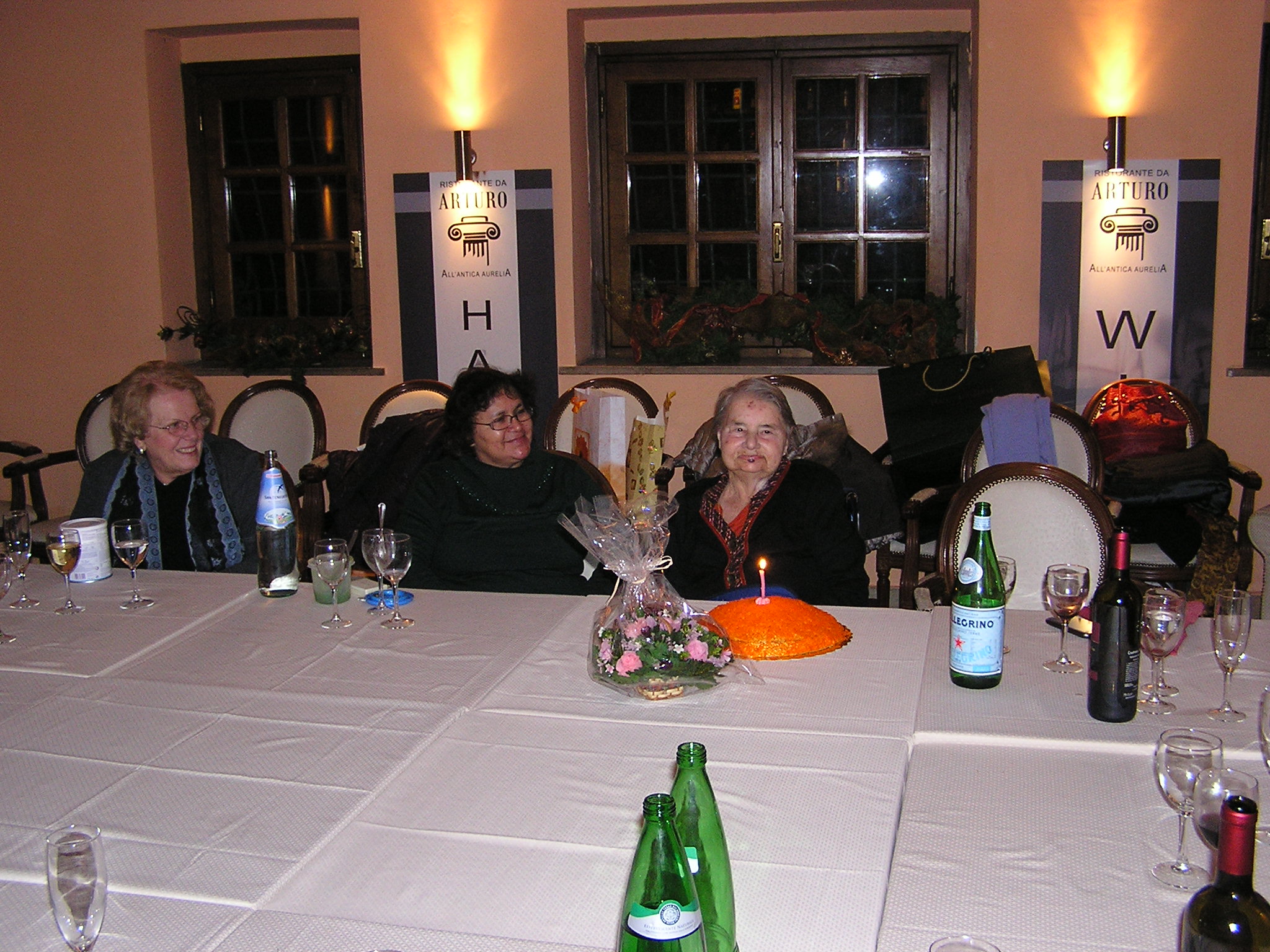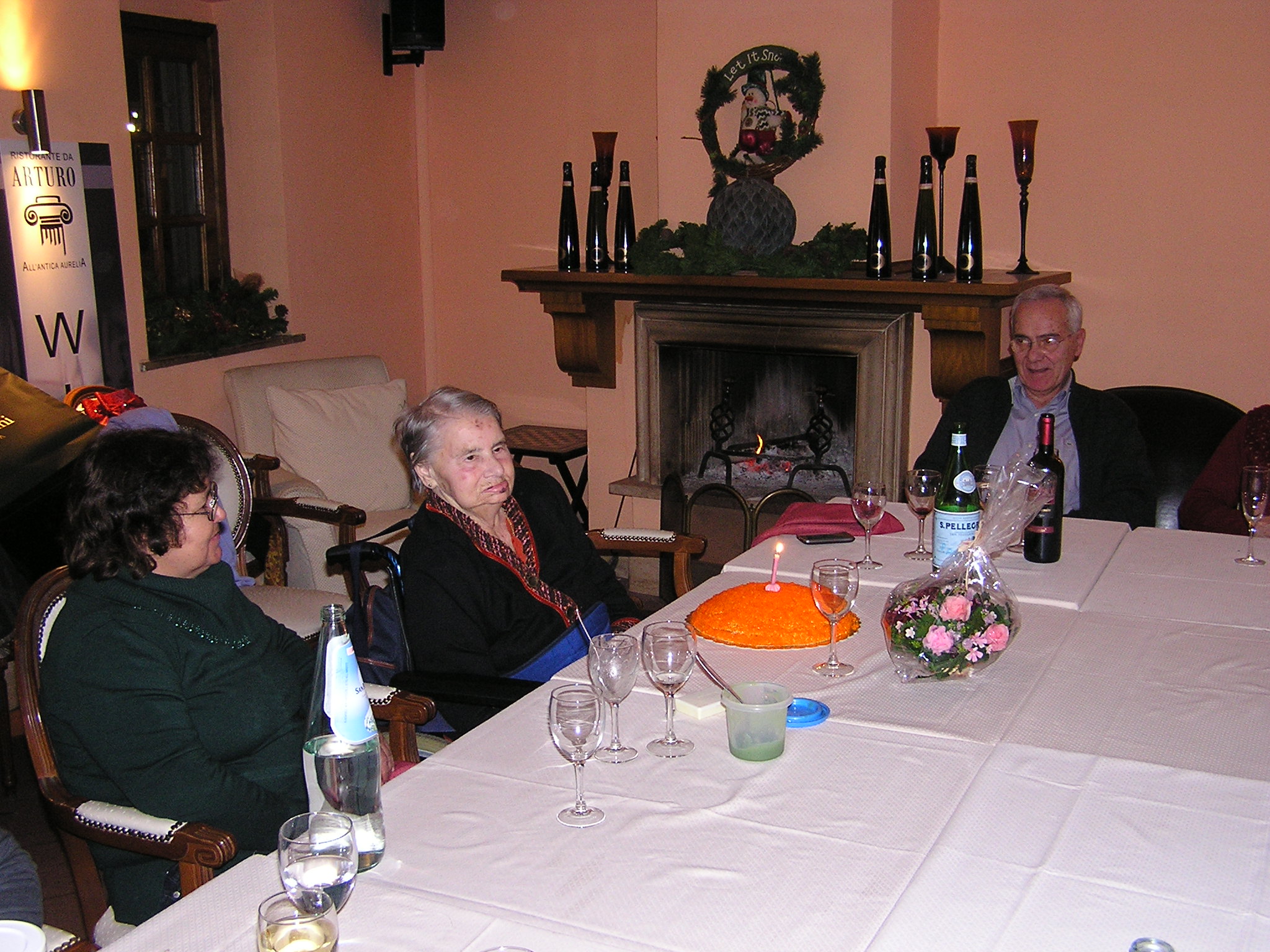 | Martedì, 4 Gennaio 2011 | La mattina la dedichiamo ad alcune spese in farmacia, poi dopo il pranzo e la Messa partecipata con devozione da Santina, usciamo per visitare la terza basilica romana: San Paolo fuori le mura. Torniamo a casa per prepararci per la cena e poi andiamo al Ristorante sull’Aurelia antica per festeggiare gli 85 anni di Santina. Una bella saletta con il fuoco acceso e con piacevoli canti natalizi accompagna la festa e la torta di buon compleanno. A Santina faccio assaggiare un piccolo goccio di vino e mi risponde: “…ma non l’ho neanche bevuto!” Le do un gran bacione e Lei sorride contenta. Stanchi morti torniamo a casa per il riposo notturno. |