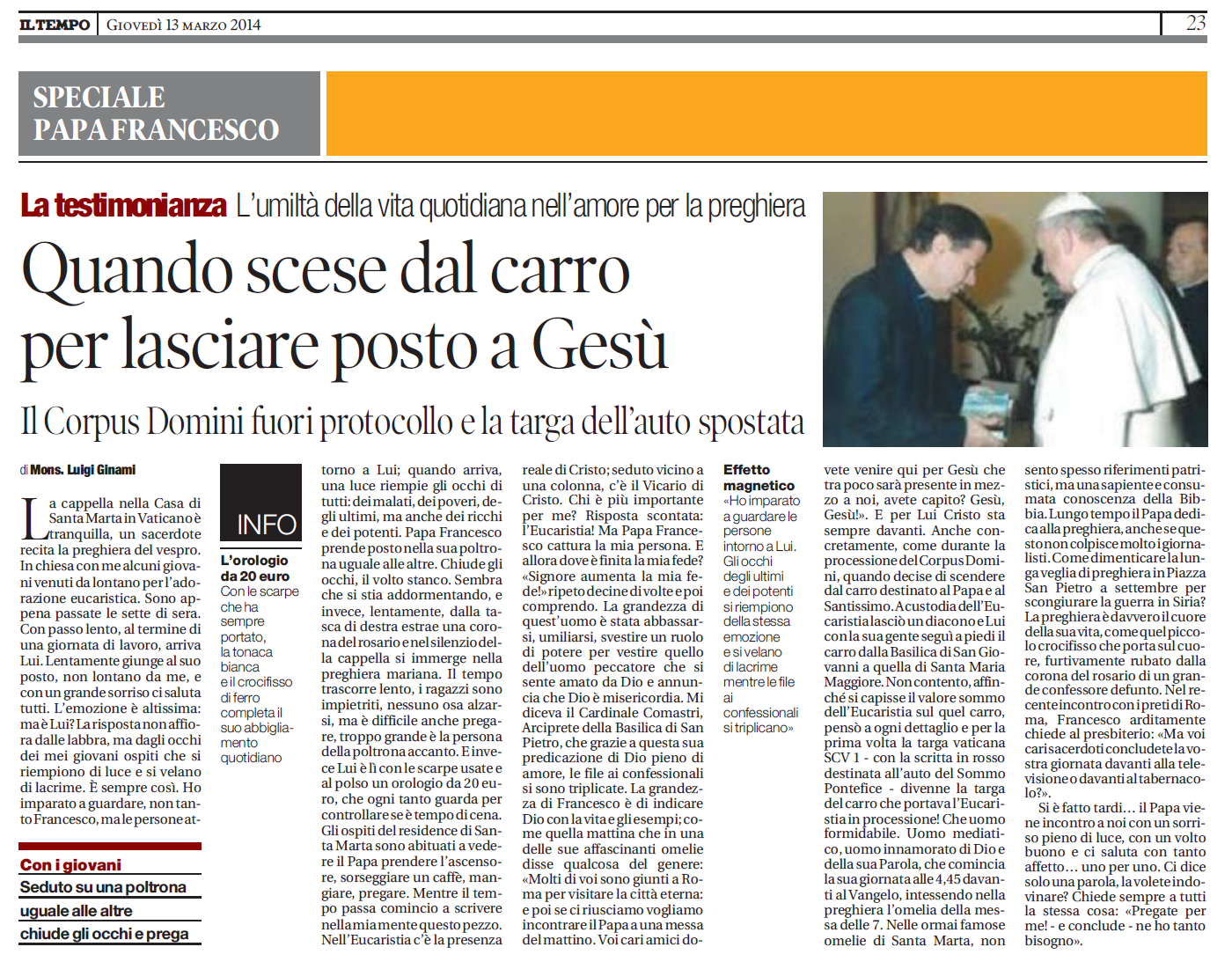 Il libro è stato presentato a Papa Francesco. Il giorno dell’anniversario della sua elezione al Pontificato il quotidiano di Roma IL TEMPO ha dedicato spazio ad una riflessione sul papa in preghiera che di seguito riportiamo in formato pdf: IL TEMPO 13-03-2014