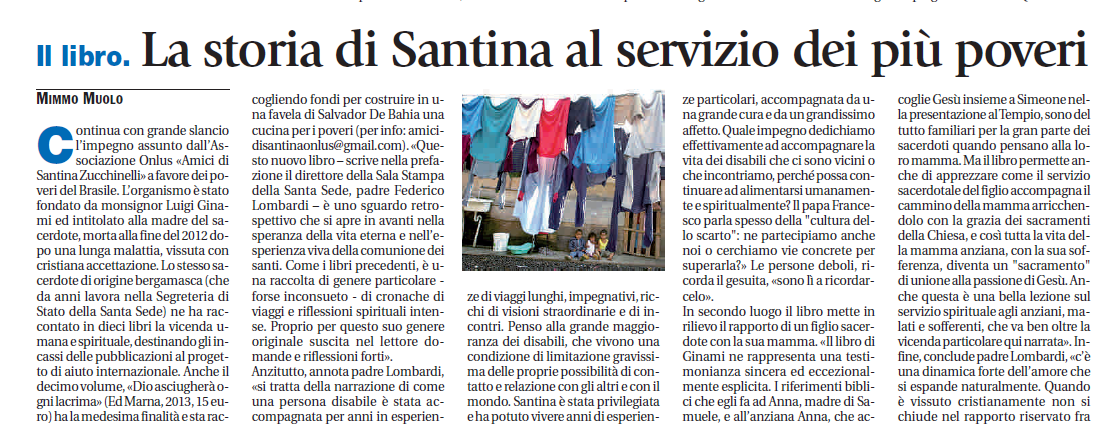 Un anno fa, come oggi, moriva Santina Zucchinelli. Proprio in questa data esce nelle librerie l’ultimo dei 10 libri su di Lei dal titolo Dio asciugherà ogni lacrima. (Ed Marna, 4 dicembre 2013) scritto dal figlio Mons. Luigi Ginami. L’ASSOCIZIONE ONLUS AMICI DI SANTINA ZUCCHINELLI vende il libro per costruire in una favela di Salvador De Bahia una cucina per i poveri (per acquisto Euro 15 in beneficenza amicidisantinaonlus@gmail.com oppure 3290985258). Due gli appuntamenti. Nella giornata di oggi 4 dicembre 2013 alle ore 16,30 nella Basilica di San Pietro il Cardinal Angelo Comastri presiederà una solenne eucaristia in suffragio di Santina in presenza dei due fratelli Luigi e Francesco Zucchinelli. Seguirà la proiezione del DVD realizzato da Radio vaticana Un sorriso di luce in paradiso e una cena di solidarietà all’ESH HOTEL, Via di Torre Rossa 80 a Roma. Sempre a Roma l’ASSOCIAZIONE SANTINA ZUCCHINELLI presenterà il libro il 9 dicembre a Palazzo Altieri alle ore 18,30 nella sede de Banco Popolare di Verona, in Piazza del Gesù 49. Guiderà la serata il Dottor Carlo Nicora Direttore Generale dell’Ospedale Papa Giovanni XXIII di Bergamo ed interverranno P. Federico Lombardi S.J., il Card. Angelo Comastri, Chiara Geronzi e Maurizio Zancanaro.