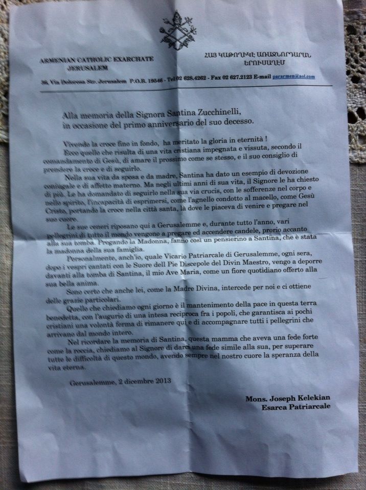 Lettera di S.E. Mons. Joseph Kelekian, Esarca Armeno Cattolico di Gerusalemme, in occasione del Primo Anniversario della morte di Santina