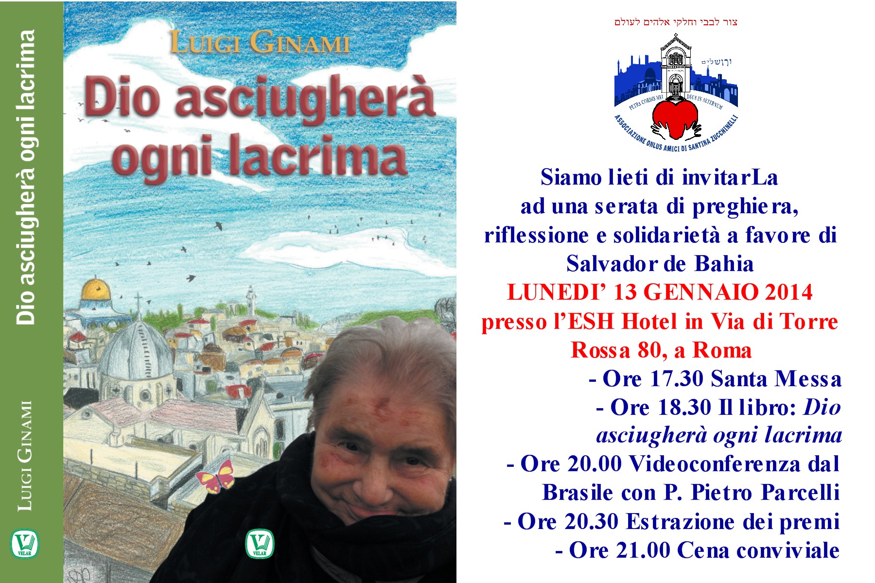 Per concludere queste feste di Santina iniziate il 1° novembre 2013, ci troveremo tutti all’Executive Style Hotel in via di Torre Rossa 80 a Roma per un pomeriggio di preghiera, riflessione e solidarietà con Salvador de Bahia. Accluso a questa news letter troverete un invito che vi spiegherà ogni dettaglio del pomeriggio che avrà le seguenti componenti: