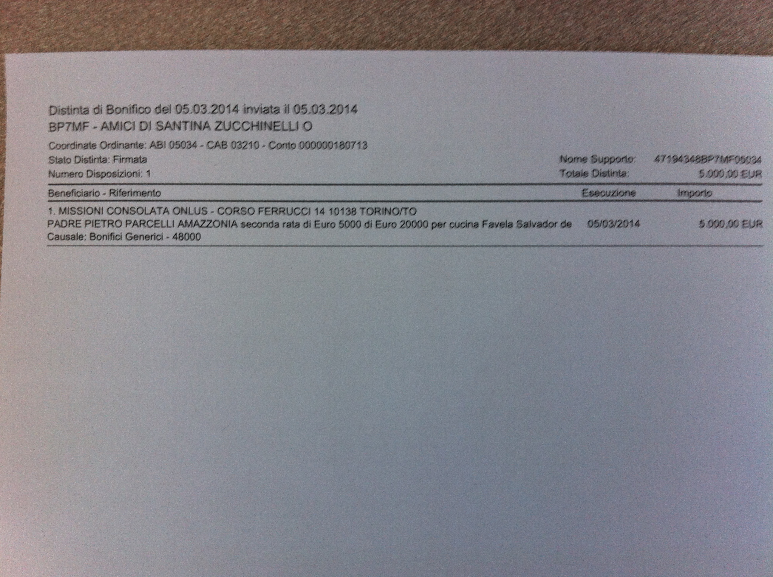 Visto il resoconto puntuale e dettagliato del lavoro, il Comitato Direttivo riunitosi in data 28 febbraio 2014 decide di stanziare Euro 5000 come seconda rata dei lavori. Il bonifico viene effettuato simbolicamente il Mercoledì delle Ceneri, 5 marzo 2014 ecco fotografia e pdf del regolare versamento: