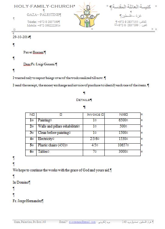 Uno dei frutti più significativi della nostra Missione Restoring Hope in Gaza 2014 è stata la decisione di prenderci a carico della ristrutturazione dei locali dell’oratorio della Parrocchia cattolica Sacra Famiglia a Gaza City, nella Striscia di Gaza. Parlando a lungo con Padre Jorge Luis Hernandez durante il nostro soggiorno dal 20 al 23 Ottobre 2014 abbiamo manifestato a don Giorgio il nostro desiderio di essere vicini alla Comunità cattolica di Gaza che è molto piccola e conta solo 130 persone. I nostri mezzi sono davvero esigui per fronteggiare enormi spese di ricostruzione, ma nel nostro piccolo vogliamo essere presenti e siamo convinti che anche una piccola goccia può contribuire a lenire la sete di chi sta soffrendo la terribile sete di una ricostruzione dopo i disastri della guerra estiva durata 50 giorni. Ho chiesto così a Padre  Giorgio di inviarmi un progetto di spesa a fronte del quale la nostra ONLUS AMICI DI SANTINA ZUCCHINELLI verserà le spese di copertura del progetto a fronte di una targa commemorativa della nostra Associazione. Dopo uno scambio di Mail tra Padre Giorgio e Caterina Piantoni Responsabile del progetto di ristrutturazione e che ha preso parte alla nostra recente missione umanitaria nella Striscia di Gaza vogliamo in questa pagina mostrare il progetto inviato a noi nei giorni scorsi da Padre Jorge.