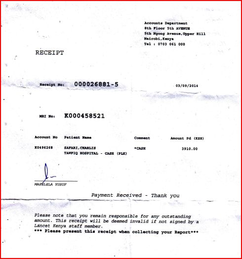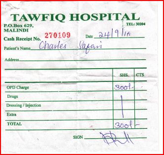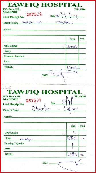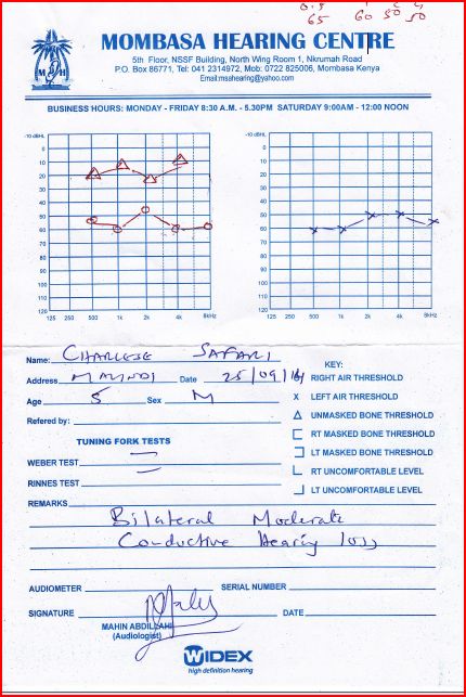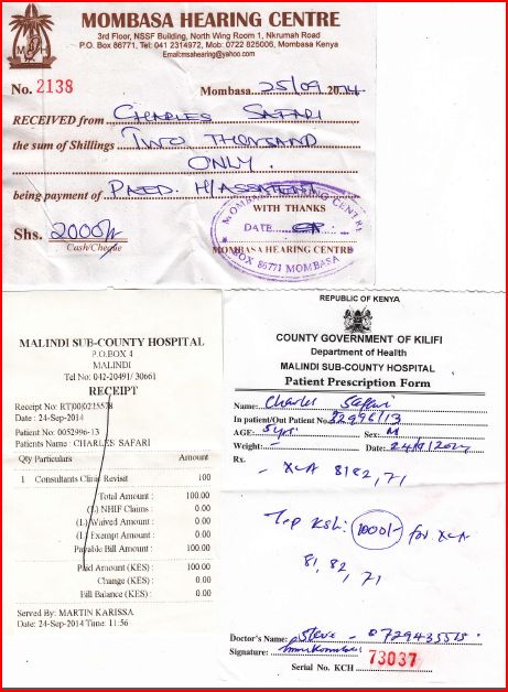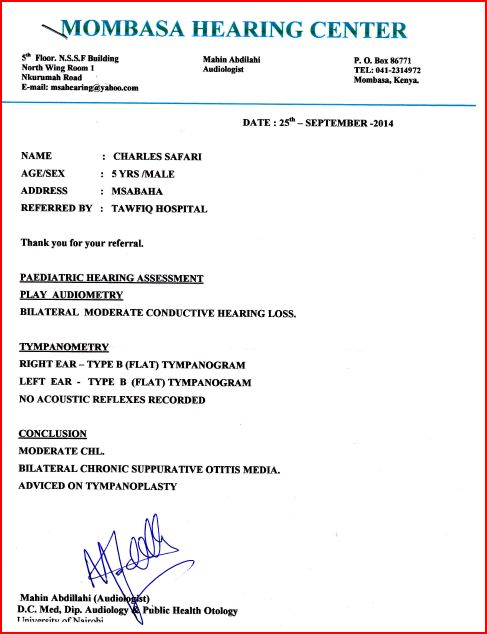 Carissimo Luigi,s pero stai bene! Charles ha finito la cura con gli antibiotici, cosi siamo oggi andati a Mombasa in una clinica specializzata  di otoiatria per vedere bene quale sia il problema. Qui a Malindi non ci sono gli apparecchi per farlo. Abbiamo fatto tre scoperte importantissime. Alcune buone, alcune di meno. La prima cattiva – tutte due timpani di Charles sono rotti, ha perso 45 per cento del udito. Seconda e buona – altre parti delle orecchie  funzionano benissimo, allora e recuperabile con una operazione plastica, il problema – costa troppo. Terza buona – una volta al anno vengono i dottori da Norvegia a Nairobi per fare queste operazioni e il costo viene molto di meno. Il dottore di Mombasa  ha chiamato a Nairobi e ha confermato che dovrebbero venire proprio questo novembre! Lunedì devo ancora confermare i dettagli. osa dici? Senza il vostro aiuto non potremo farlo…Per favore vedi nel allegato le ricevute di 10000kenyan s hillings (i soldi che ho ricevuto dagli bravi amici mandati da te – Mara Aresi con il marito) e i risultati della clinica di otoiatria.G razie, Dio Ti benedica! Jarka, Ushirikiano centre.