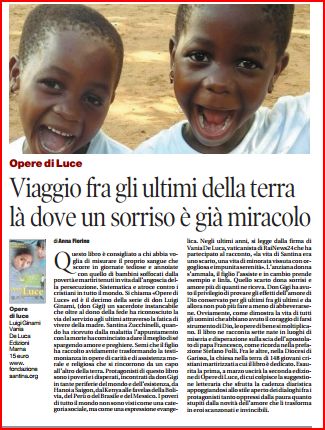 In diversi passaggi del libro si fa espressamente riferimento alla carne o al volto di Gesù nella carne o nel volto di chi è povero, di chi è malato, di chi soffre… Non sono solo citazioni di passaggio, ma fanno parte della sostanza stessa delle testimonianze proposte, perché come è sottolineato nel capitolo conclusivo “non è né facile né scontato, neanche per i credenti, vedere o toccare Gesù in un corpo ferito o piagato”, eppure questa “è una provocazione forte, che spinge a farsi tante domande”, soprattutto per chi tende a una vita forgiata dallo Spirito Santo e vissuta in mezzo alle sofferenze del popolo di Dio.Lo sa bene Papa Francesco che, quando era Cardinale e mio Arcivescovo di Buenos Aires, nell’omelia del 7 agosto 2009 al Santuario di San Cayetano de Liniers, richiamata nelle conclusioni di questo libro, invitava a vedere Gesù nel volto “dei poveri, degli afflitti e dei malati… dei nostri amati fratelli che ci testimoniano la fede, la pazienza nella sofferenza e la lotta costante per continuare a vivere” (documento di Aparecida della chiesa latino americana, 257).E sappiamo tutti come non sia facile non solo guardare gli occhi dei poveri, ma anche riconosce loro dignità, ponendoli sullo stesso piano di se stessi, o addirittura su un piano più alto. Dalla guerra di Gaza, alle 148 giovani vittime del terrorismo di Al Shaabaab a Garissa in Kenya (ai quali è dedicato spazio in un lungo capitolo), dallo splendore della natura delle Ande, delle foreste del Perù o del Vietnam, ai colori del Brasile, il libro racconta di 7 opere di luce nate in questi luoghi di miseria e disperazione, ma dove il Vangelo è ascoltato e testimoniato e la carne del Cristo sofferente vive e dà vita. Lo scopo della ONLUS “Amici di Santina Zucchinelli” è quella di cercare di essere in qualche modo una via di carità e di conversione, attraverso le sue opere di solidarietà. Tutto questo rende Santina “viva”, scrive il figlio don Gigi, per il quale questa è “una consolazione”. L’Associazione dedicata a questa donna non ha il fine filantropico della raccolta fondi e della realizzazione di progetti, ma invita chi ne è coinvolto a una piccola conversione, mettendosi in gioco in prima persona. Le opere di luce, che altro non sono che i progetti realizzati in varie parti del mondo, sono opere finalizzate a promuovere occasioni di incontro, cercando di creare comunità: così a Novos Alagados, in Brasile, è stata realizzata una cucina in una favela violenta e povera, in Kenya sono nate un’aula scolastica e una cisterna per l’acqua; in mezzo alla guerra di Gaza si è scelto di puntare sull’oratorio della parrocchia cattolica, e nel villaggio peruviano di Conima di restaurare la chiesa, centro della vita non solo religiosa, ma anche sociale del piccolo villaggio sulle rive del lago Titicaca. Nella Diocesi Garissa infine, è iniziata la costruzione di una chiesa in un luogo dove possedere una Bibbia equivale ad avere un arsenale di bombe nell’armadio e dove il Vangelo è un libro molto, ma molto pericoloso. La scommessa di costruire un luogo di culto cristiano in una terra bagnata dal sangue dei 148 giovani martiri uccisi per il semplice fatto di essere cristiani, costituisce infine un seme di speranza, un faro di luce nelle tenebre della disperazione e dello sconforto. Proprio per questo sono felice che il libro sia dedicato a questi eroici giovani che hanno dato la vita per Gesù. E poi ci sono le adozioni a distanza, che puntando sui più piccoli, guardano in qualche modo al futuro. Tutti i racconti dei viaggi narrati da don Gigi in questo libro, che vanno da Gaza al Vietnam, dall’America Latina all’Africa… a Garissa, sono originati non solo dalla volontà di realizzare opere, quanto piuttosto “di avviare percorsi di solidarietà e condivisione, anche piccoli, e di coinvolgere persone, favorendo incontri, reti di conoscenze e amicizie”, promuovendo uno sguardo verso il prossimo che sia “da vicino”, per stabilire delle relazioni in cui “ciascuno guarda ma anche è guardato”, per diventare capaci di “reggere” anche lo sguardo dei poveri. E’ in questo “incrocio di sguardi” che si realizza il miracolo che rende bella la vita. Mi auguro che il libro ci aiuterà a vivere con intensità l’imminente Anno Santo della Misericordia, in cui dobbiamo, per concludere con le parole di Papa Francesco: “lasciarci sorprendere da Dio. Lui non si stanca mai di spalancare la porta del suo cuore per ripetere che ci ama e vuole condividere con noi la sua vita” (Bolla di indizione del Giubileo Straordinario della misericordia Misericordiae Vultus, 25)