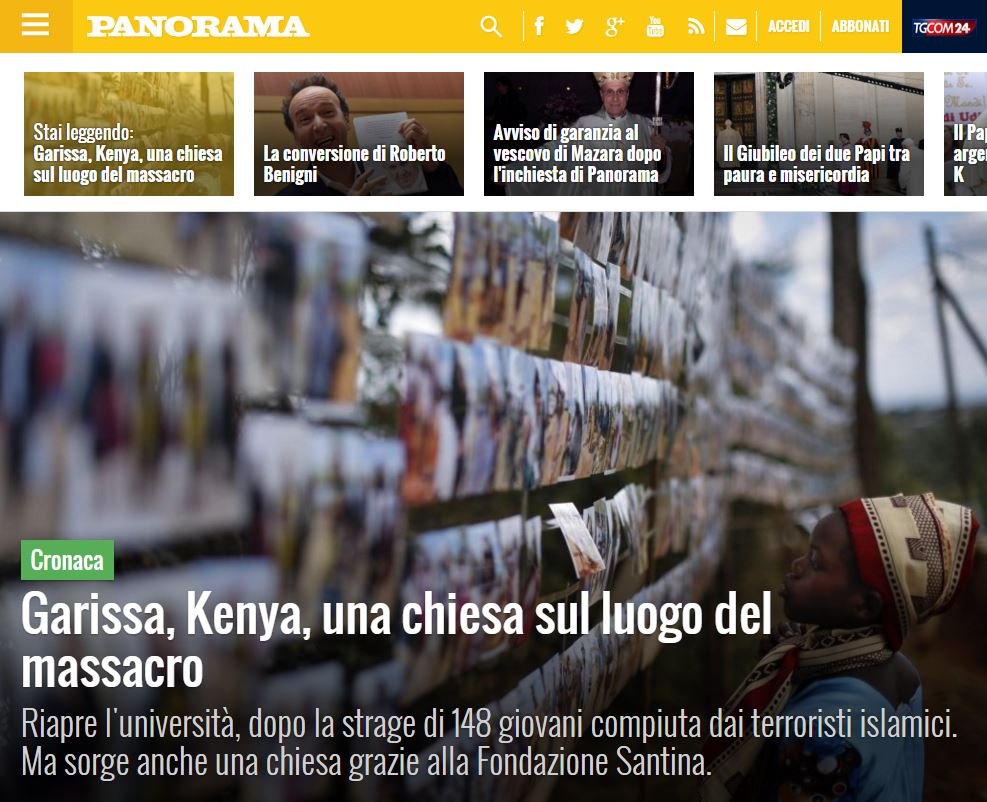 “Nella Diocesi di Garissa, in Kenya, è iniziata la costruzione di una chiesa in un luogo dove possedere una Bibbia equivale ad avere un arsenale di bombe nell’armadio e dove il Vangelo è un libro molto, ma molto pericoloso”. E’ quanto annuncia monsignor Guillermo Karcher, nella prefazione al libro ‘Opere di Luce’ scritto da monsignor Luigi Ginami con la vaticanista Vania De Luca, dove vengono ricordate e illustrate le iniziative di solidarietà e di volontariato messe in cantiere dalla fondazione Santina, dedicata alla figura di Santina Zucchinelli, di cui Ginami è fondatore e presidente. Il volume sarà presentato il 4 dicembre a Roma, a Palazzo Altieri, da monsignor Nunzio Galantino, segretario generale della Cei, la Conferenza Episcopale italiana, dal direttore di Tv2000 Lucio Brunelli, dall’editorialista di ‘Repubblica’ Stefano Folli e dai due autori. Nel volume compaiono volti e storie vere dalle periferie del mondo: dalla striscia di Gaza a Garissa in Kenya, dal Perù al Brasile, fino al Vietnam, “toccando con mano la Carne di Cristo nei poveri e nei sofferenti”, sottolinea monsignor Ginami. Continua monsignor Karcher a proposito del Kenya: “La scommessa di costruire un luogo di culto cristiano in una terra bagnata dal sangue dei 148 giovani martiri, uccisi per il semplice fatto di essere cristiani, costituisce dunque un seme di speranza, un faro di luce nelle tenebre della disperazione e dello sconforto. Proprio per questo – conclude monsignor Karcher – sono felice che il libro sia dedicato a questi eroici giovani che hanno dato la vita per Gesù”.