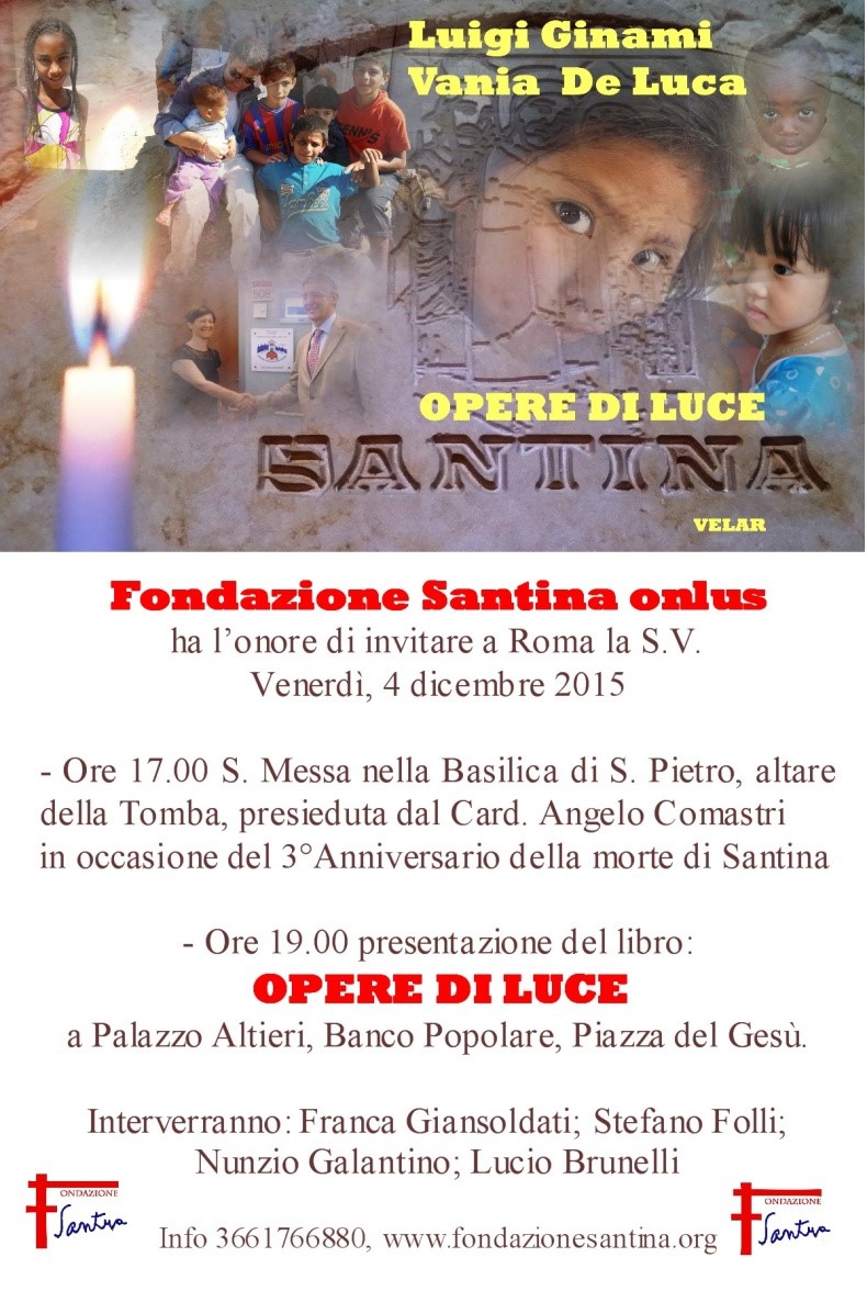 Dal 9 al 15 novembre mi recherò in Messico. L’idea è quella di sondare un po’ il terreno per vedere se anche in quella terra possiamo fare una piccola opera di luce ed adottare a distanza qualche bimbo. Pregate perché la Santina mi accompagni in questo viaggio. Al mio ritorno mancheranno pochi giorni alla festa più grande della nostra vita associativa. Il prossimo venerdì 4 dicembre 2015 sarà il terzo anniversario della morte di Santina e come ogni anno il nostro Socio di Onore Card. Angelo Comastri presiederà la celebrazione di suffragio alle ore 17,00 nella Basilica di San Pietro e poi a seguire vi sarà la presentazione del nostro nuovo libro Opere di Luce a Palazzo Altieri con la presenza di S.E. Mons. Nunzio Galantino, Segretario Generale della CEI e di altri significativi relatori. Vi attendiamo tutti, anche perché il nuovo libro merita proprio. Come ogni anno sarà un momento commovente di preghiera e di profonda meditazione: non mancate. Ecco il programma:
