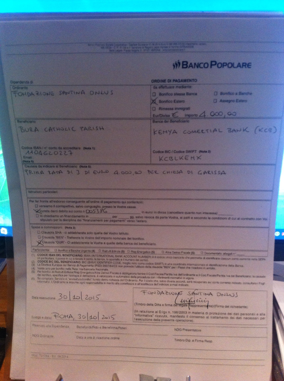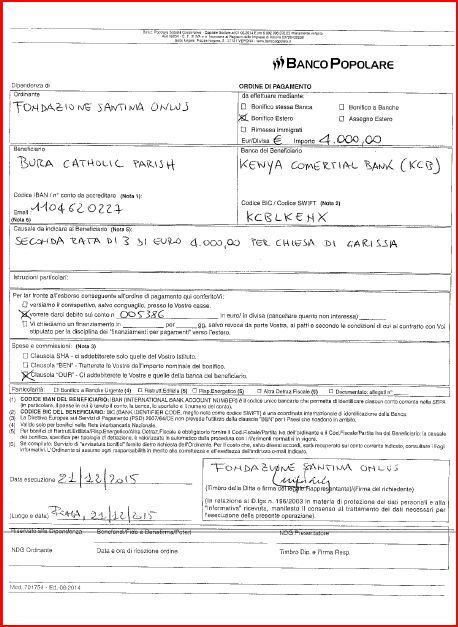 In seguito ai documenti che ci sono stati forniti, Il Consiglio di Amministrazione decide di stanziare la prima rata di Euro 4000 alla parrocchia di Bura Tana nella Diocesi di Garissa. Il nostro Tesoriere Dottor. Luigi Pacini in data 30 ottobre 2015  firma il seguente ordine di bonifico che si può vedere in formato pdf cliccando qui, mentre ecco la foto: