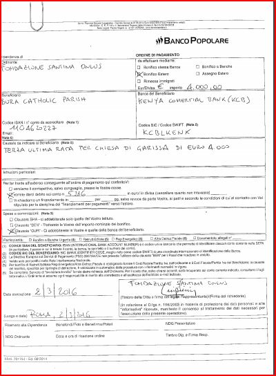 il bonifico come sempre è accompagnato da lettera al Vescovo di Garissa che si può leggere  qui