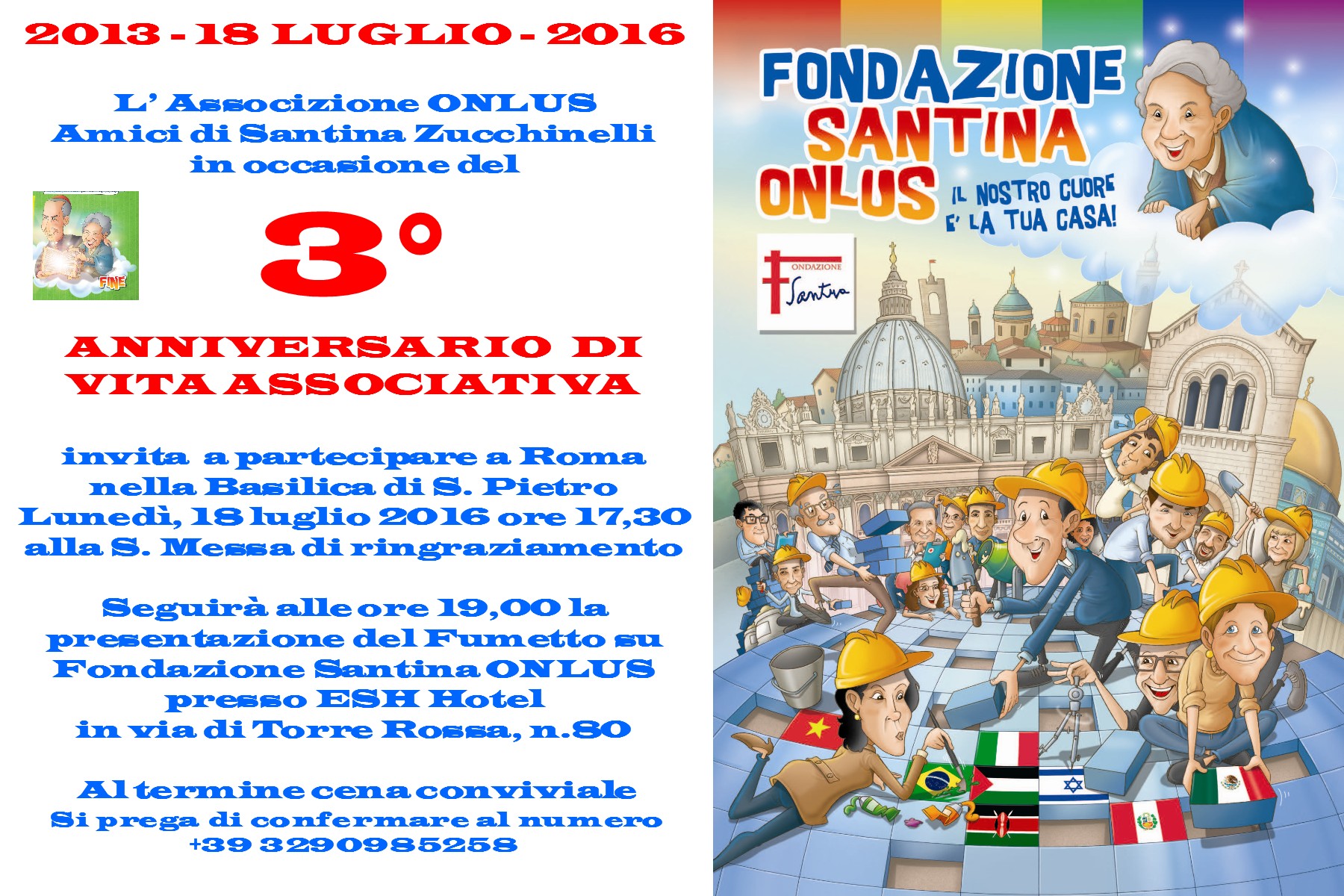 Cari Amici di Santina, sono passati tre anni! Ne abbiamo fatta di strada e vogliamo per questo ringraziare il Signore con la preghiera, la riflessione e la convivialità.