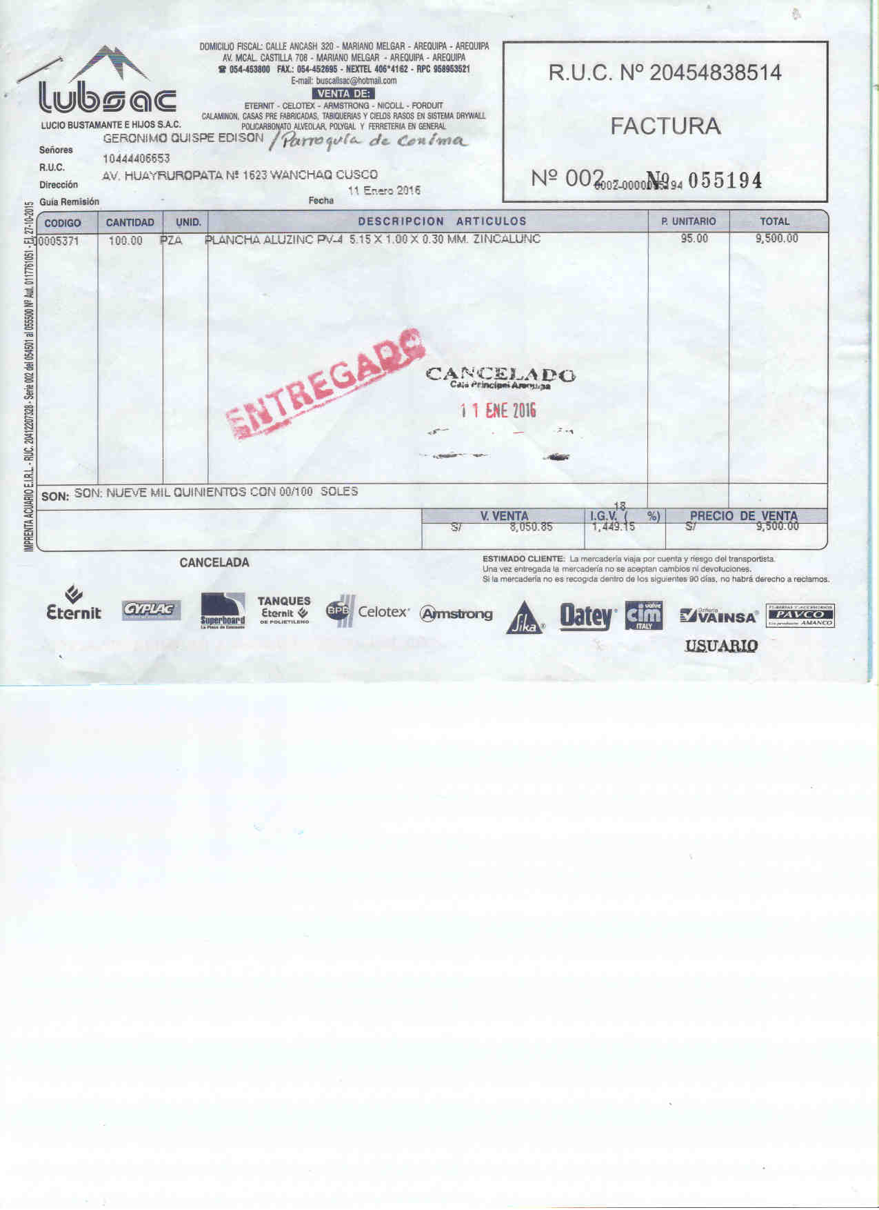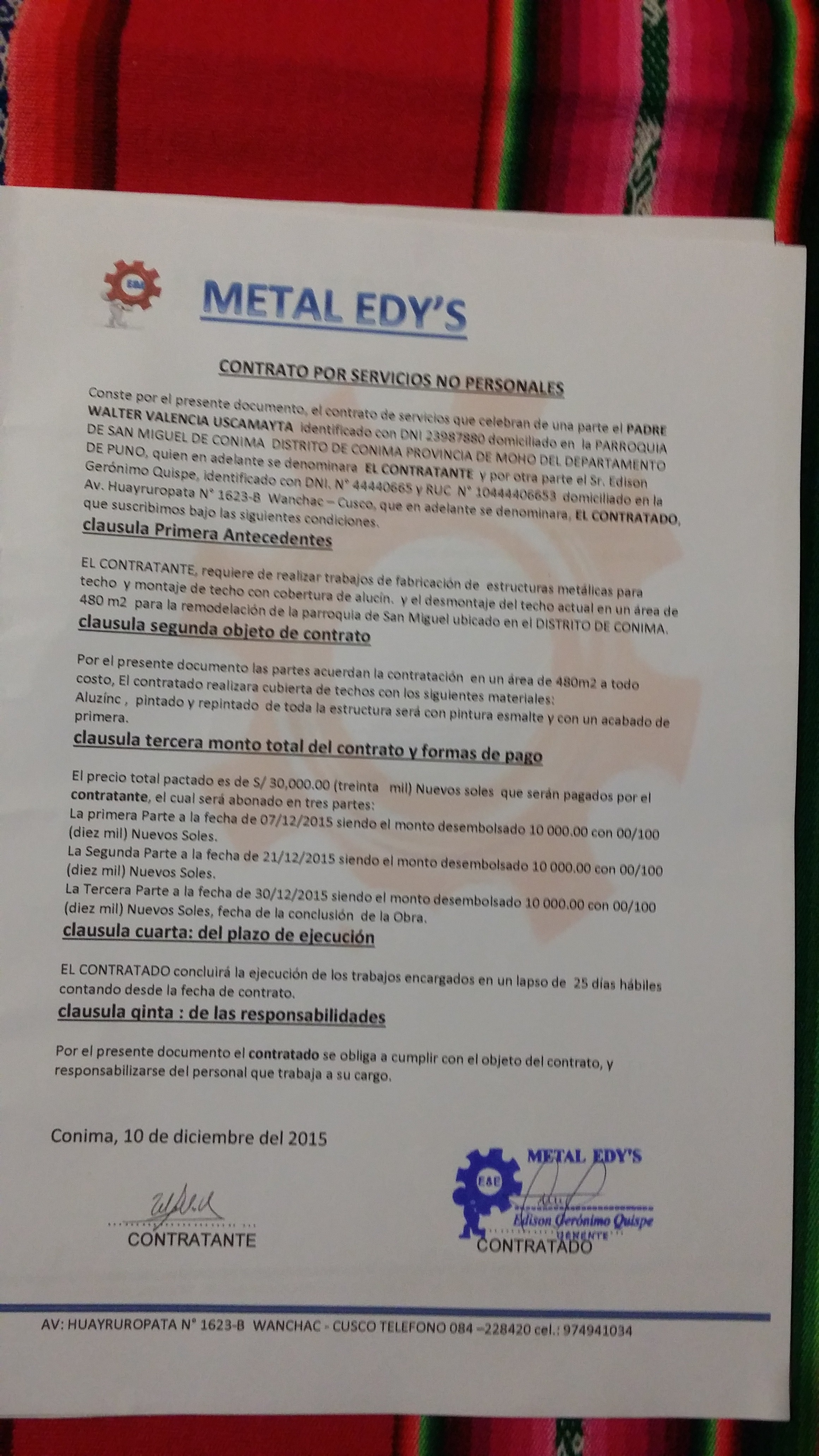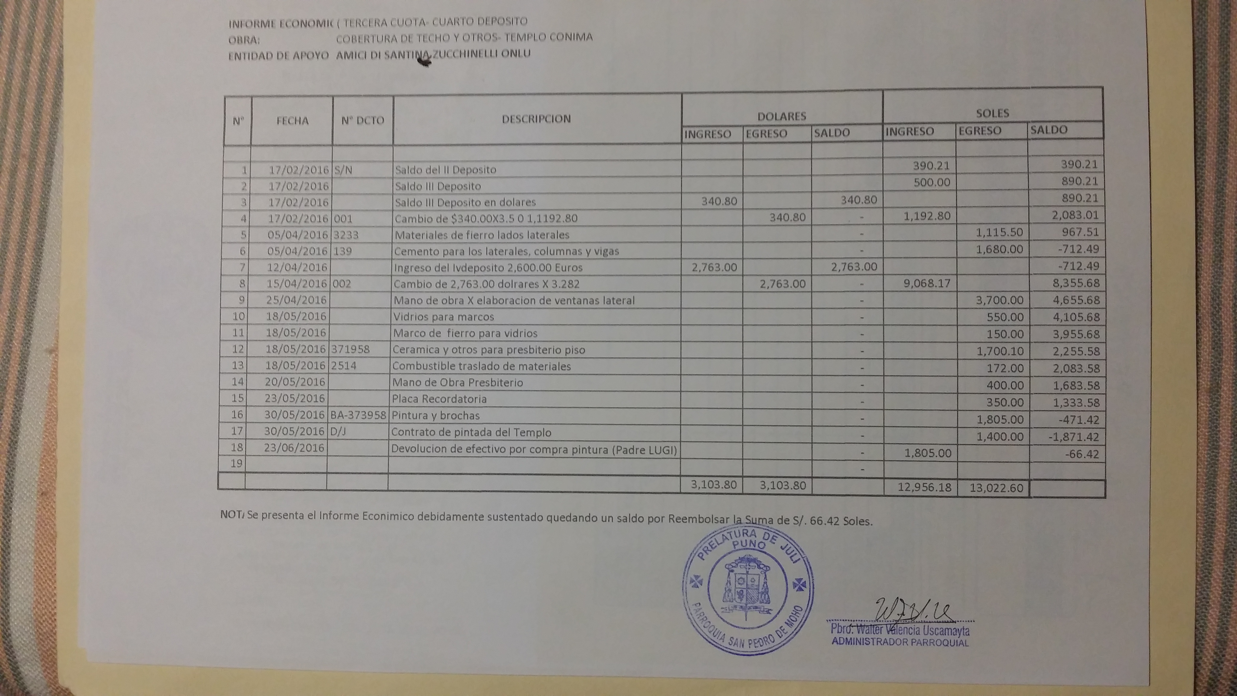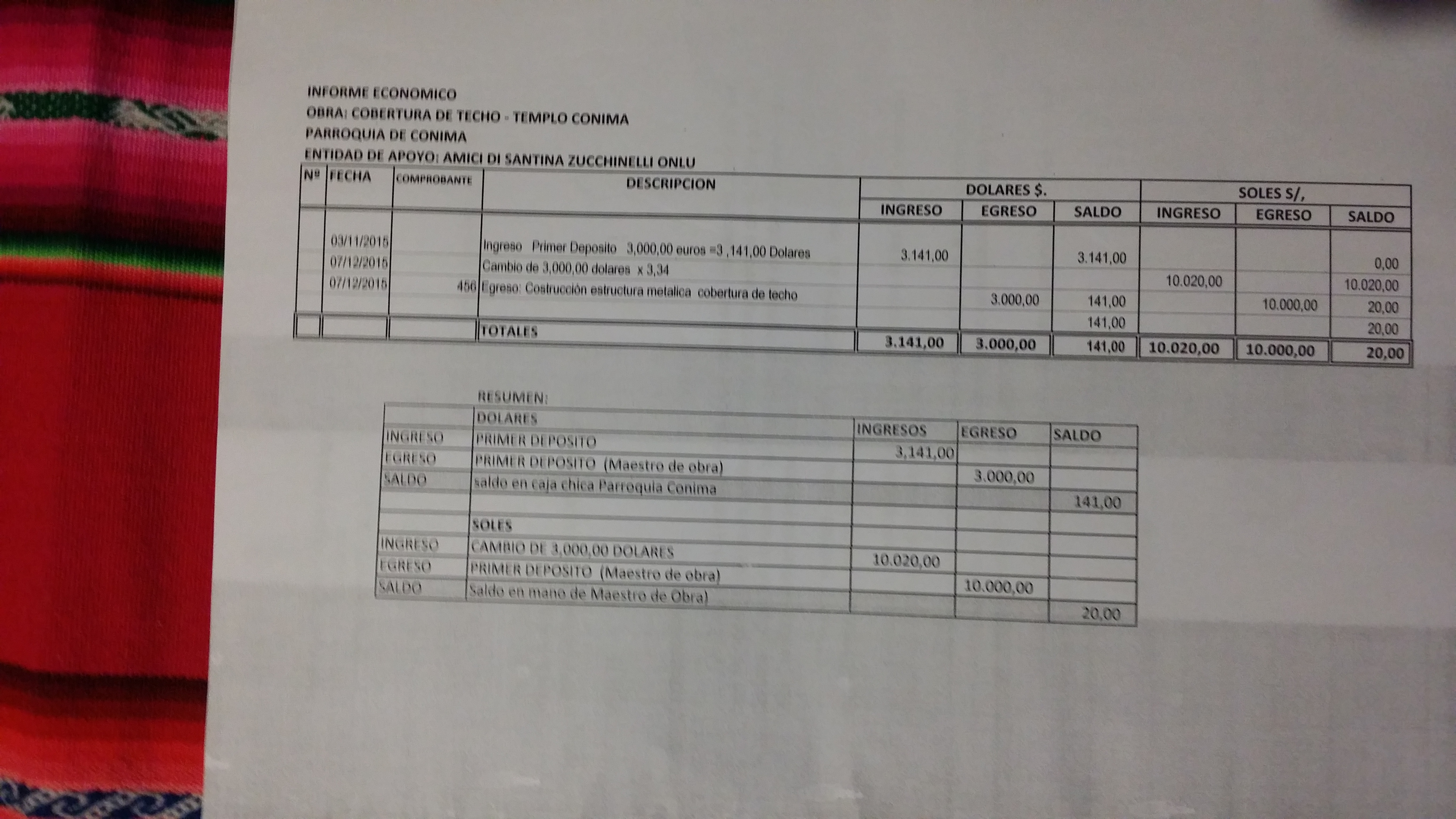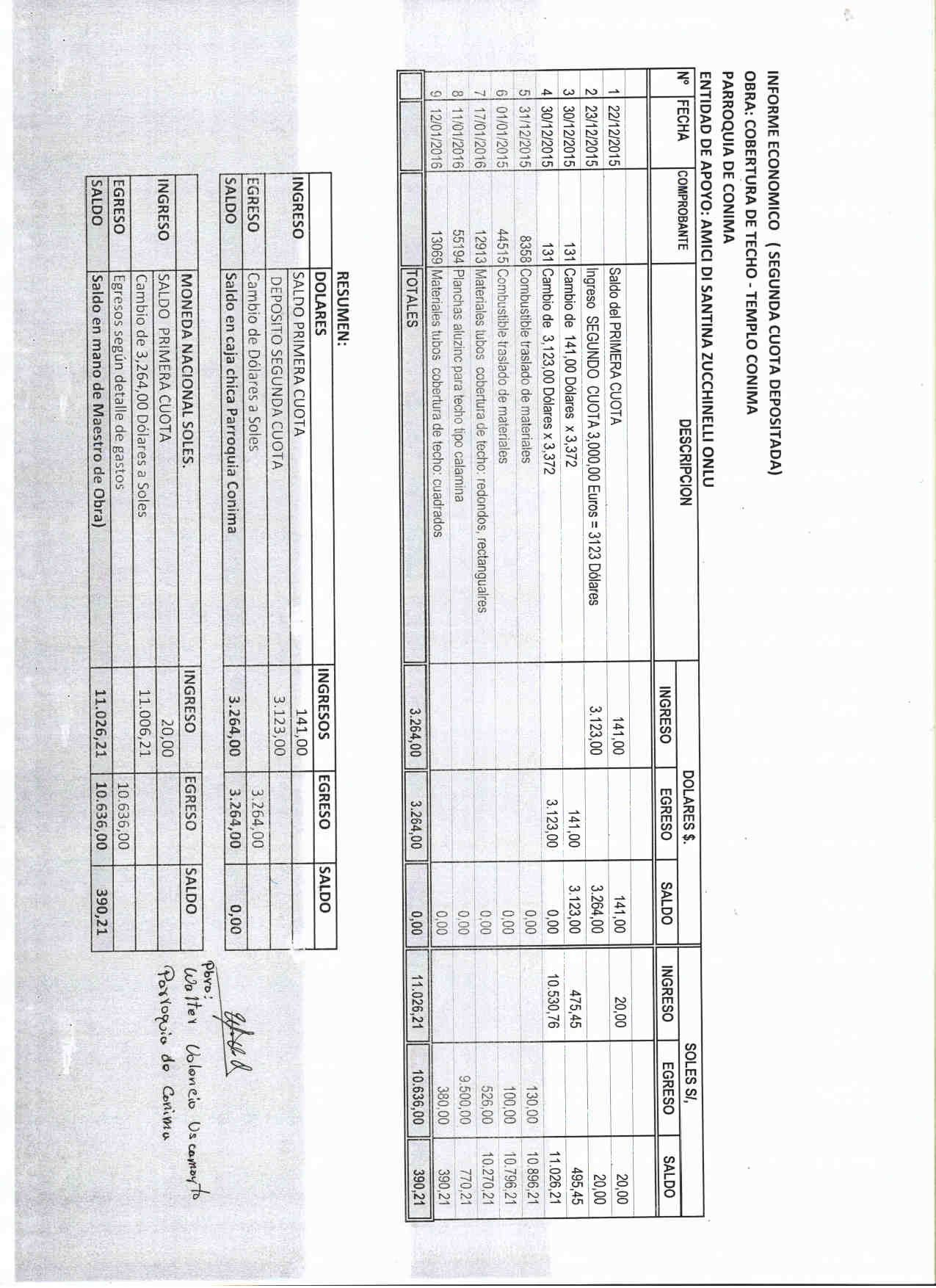 Al rientro del mio viaggio in Perù dal 9 al 20 dicembre 2015 riportavo il rapporto di come sono stati spesi i primi Euro 3000 e l’accordo quadro fatto dal parroco di Conima con i costruttori. Ecco la relazione in 5 pagine: