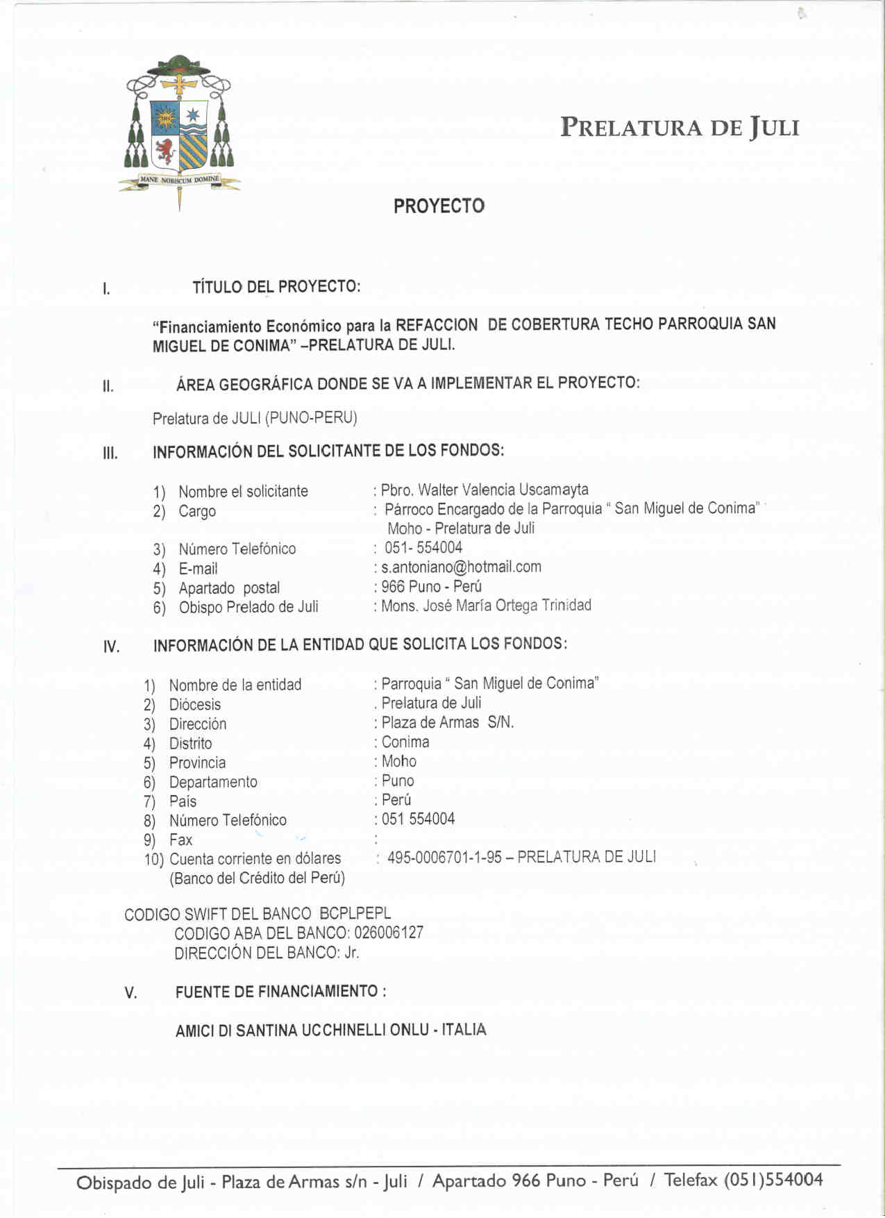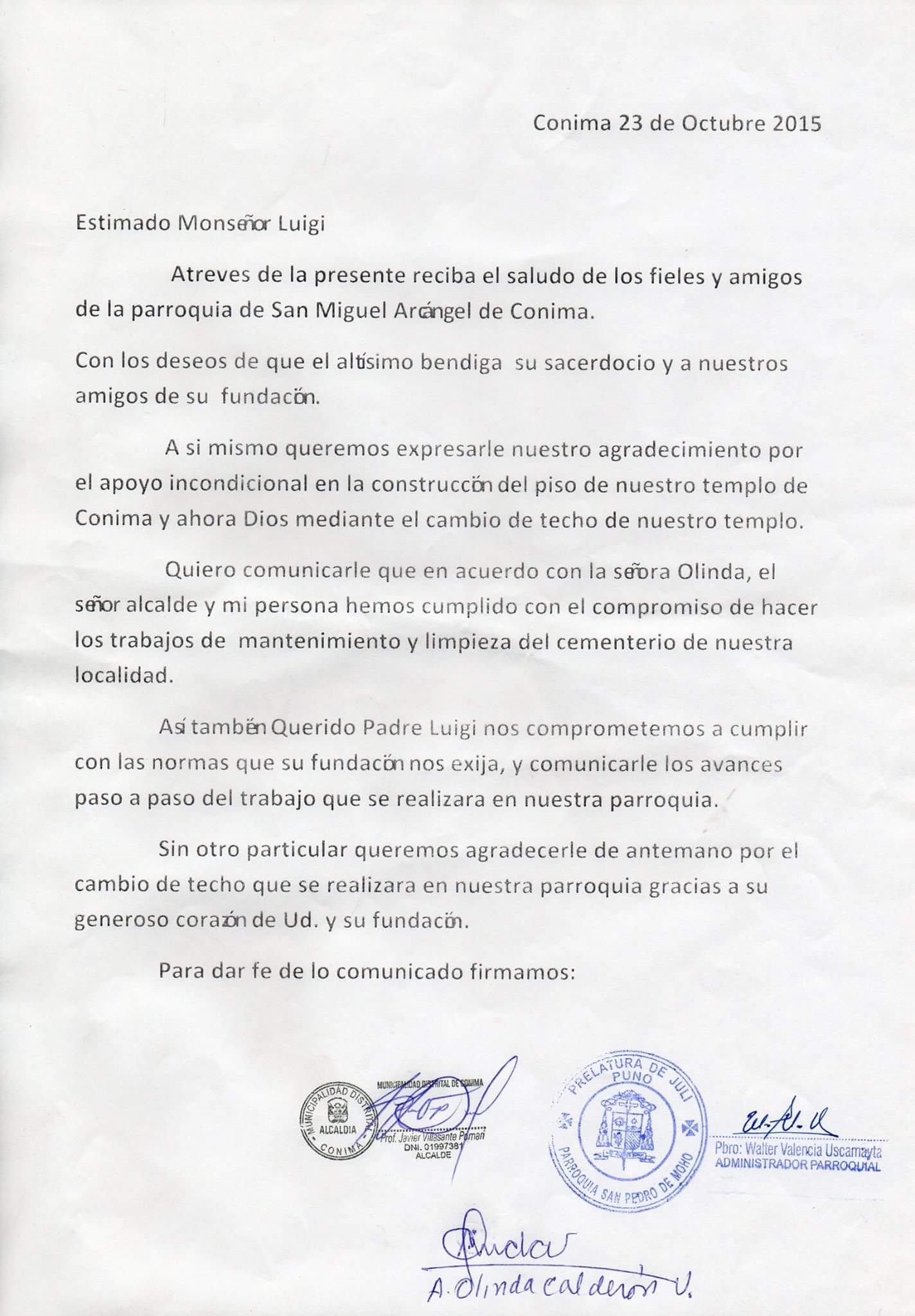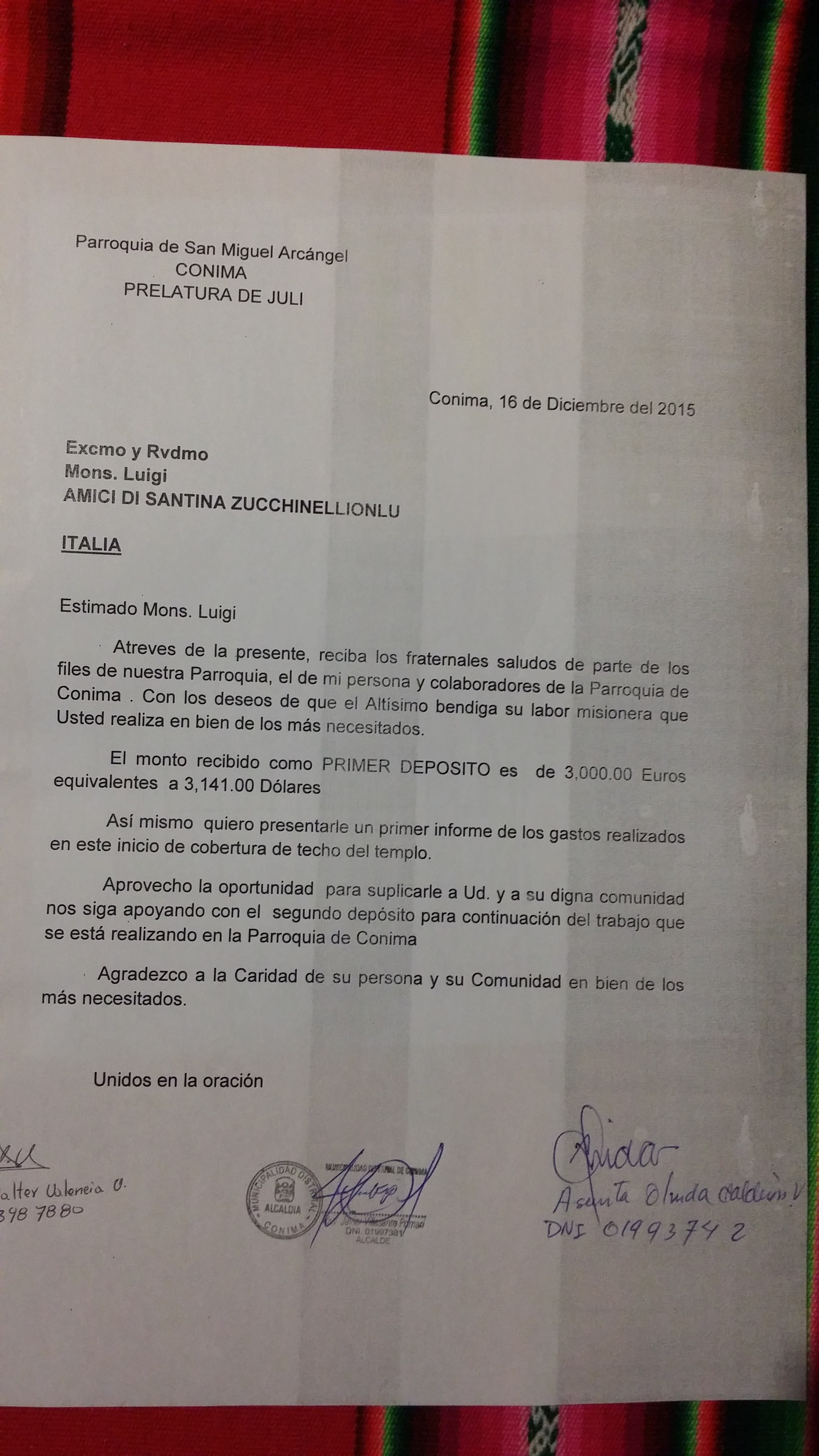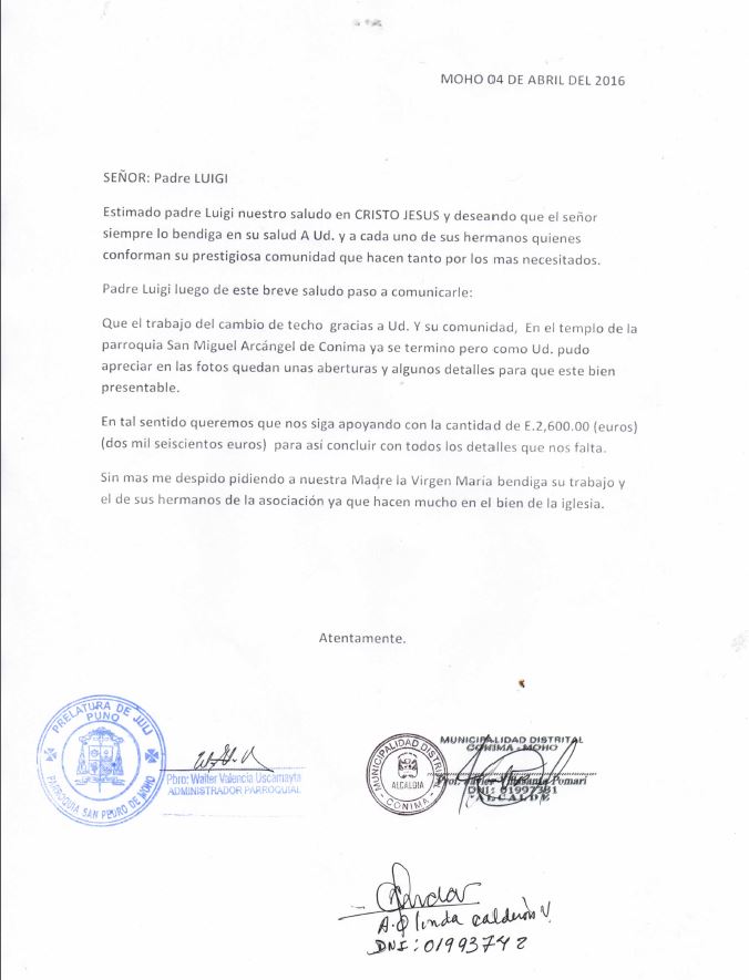 Estimado Mons. Lugi Atreves de la presente, reciba los fraternales saludos de parte Mons. José María Ortega Trinidad Obispo Prelado de Juli-Perú, y el de mi persona, con deseos de que el Altísimo bendiga la labor misionera que Ud. realiza en bien de los más necesitados. Quiero informarle que hemos recibidos los depósitos realizados por Ud. en la cuenta de la Prelatura de Juli, para el apoyo del Techo del templo de Conima.