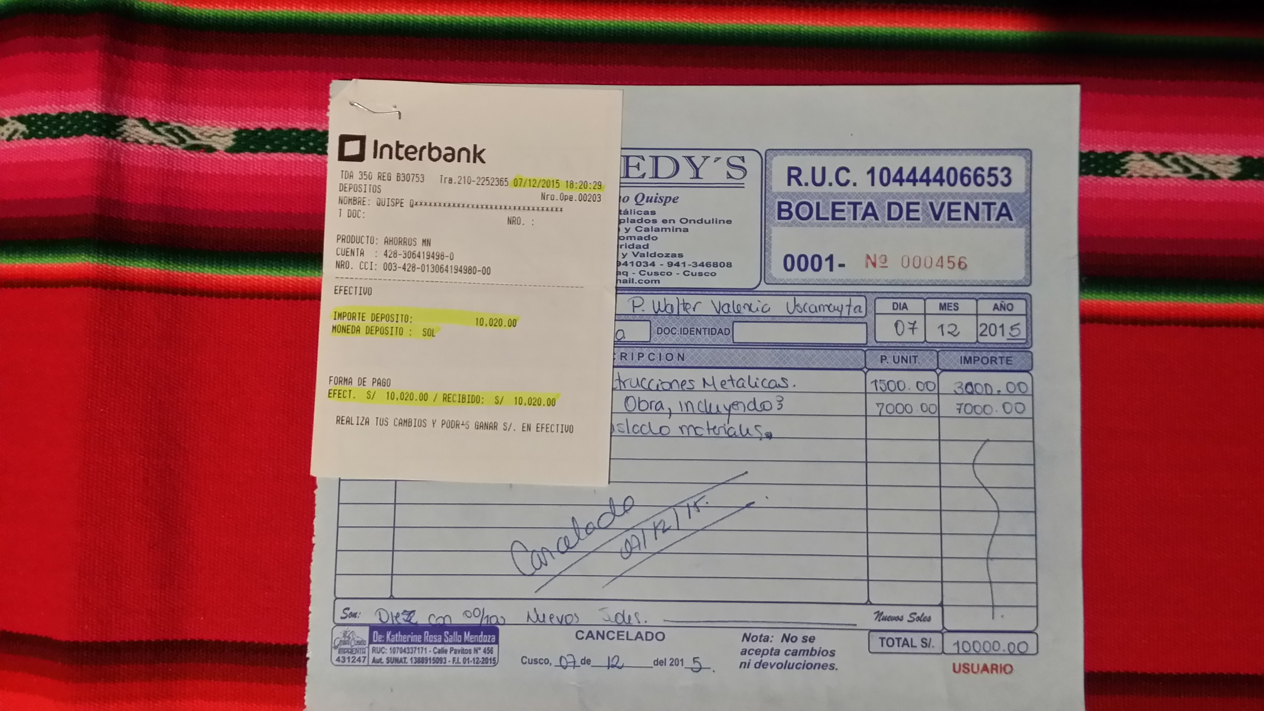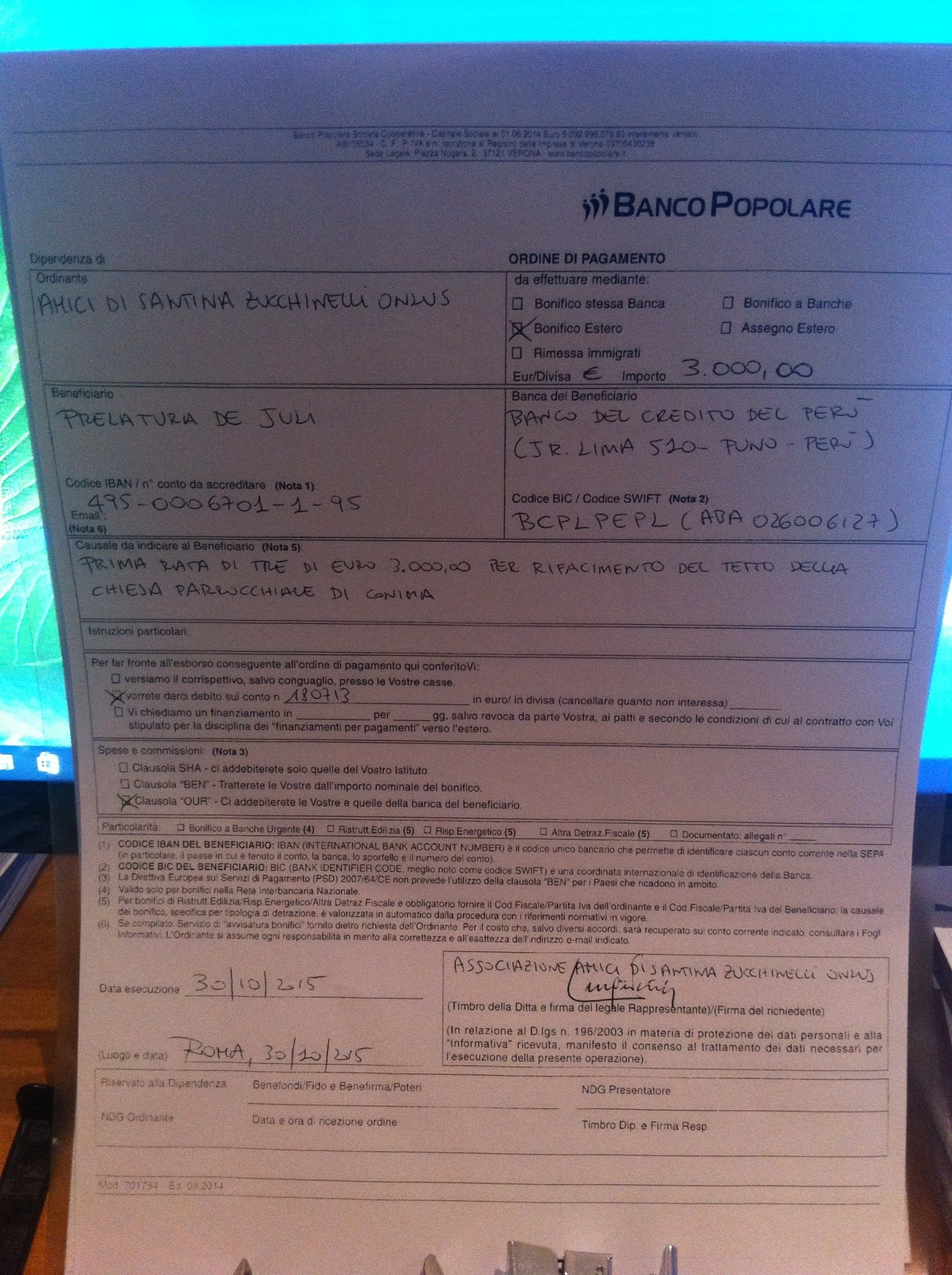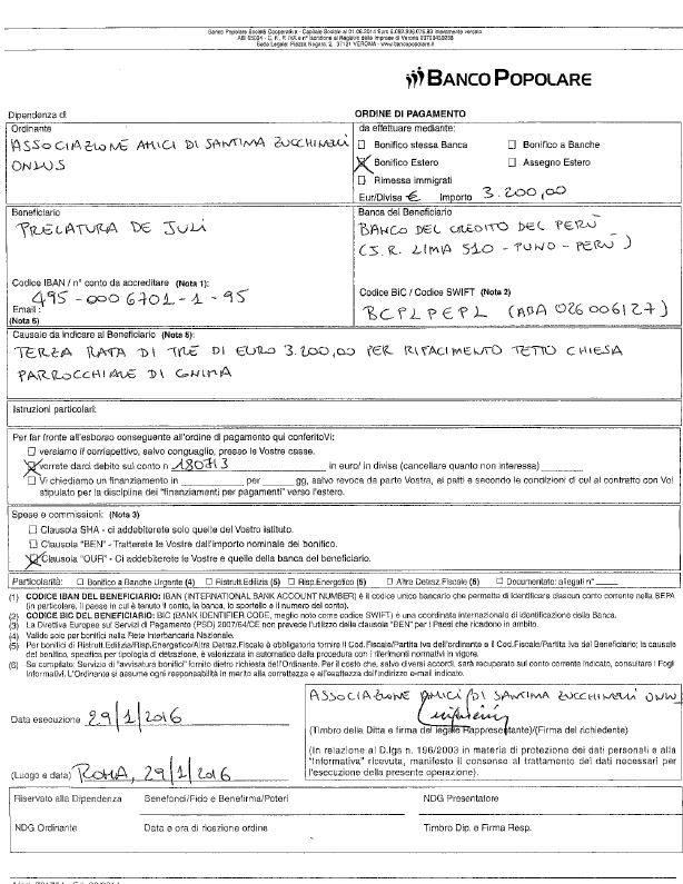 - Le tre rate saranno erogate sul conto da voi indicato nella lettera del 16 luglio 2015 della Prelatura di Juli, lo stesso usato per i precedenti lavori alla chiesa di Conima