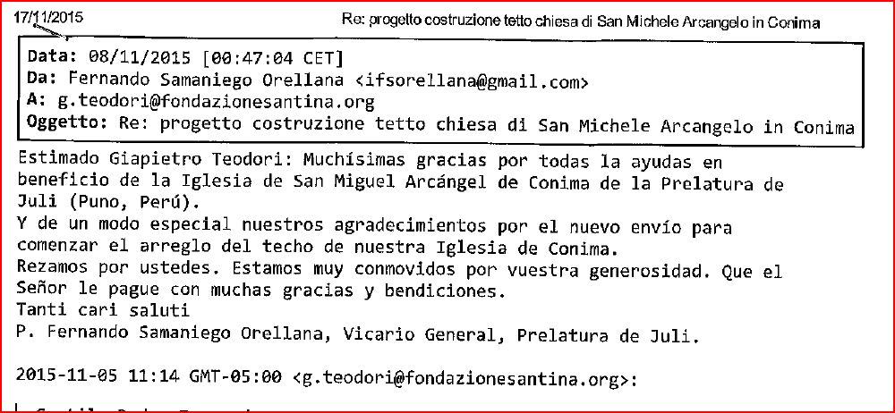 Estimados de la Associazioni Amici di Santina Zucchinelli Onlus: Les mando el ACUSE DE RECIBO de la ayuda última para la parroquia de Conima en la Prelatura de Juli. Lo envío por documento adjunto. Muchísimas gracias por la enorme y generosa ayuda en bien de nuestro Templo y de la Pastoral de Evangelización. Unidos en Jesús y María.Saludos,
