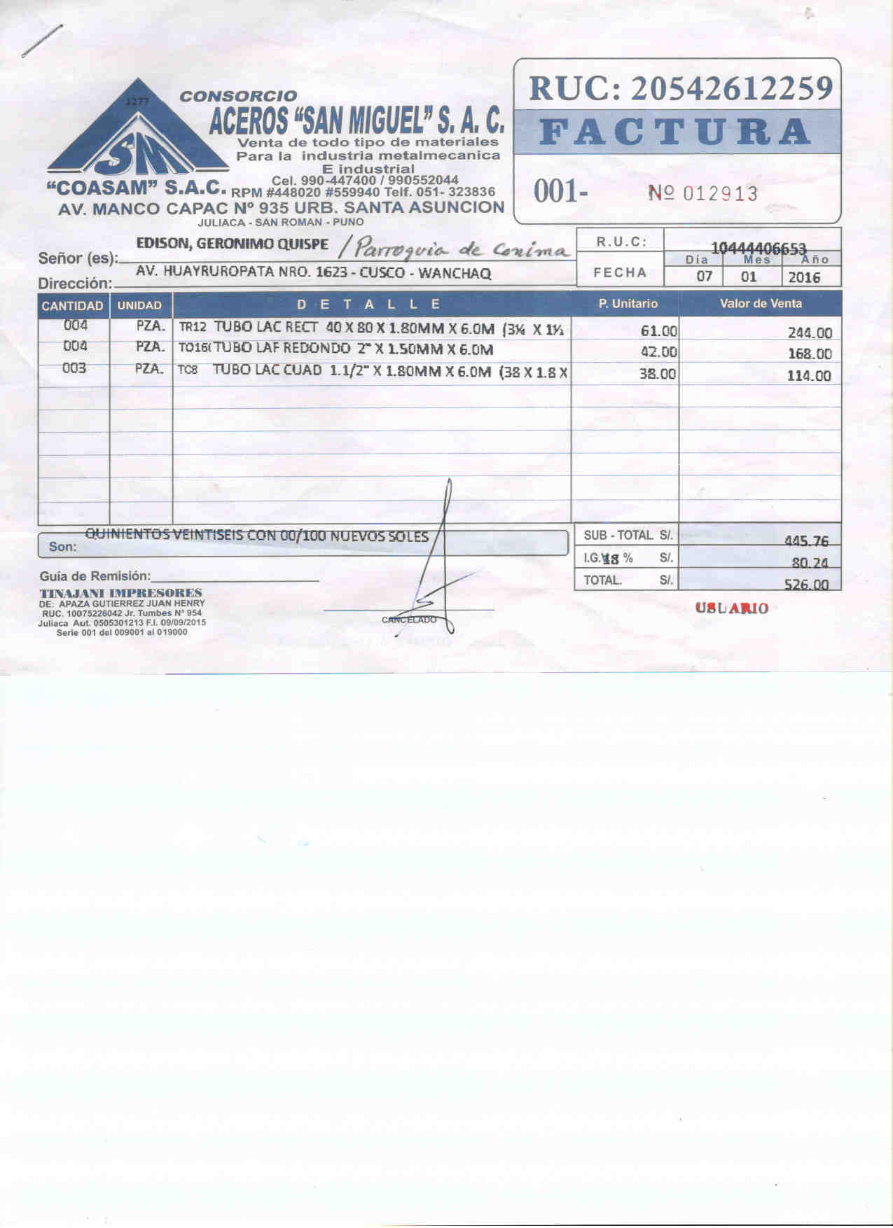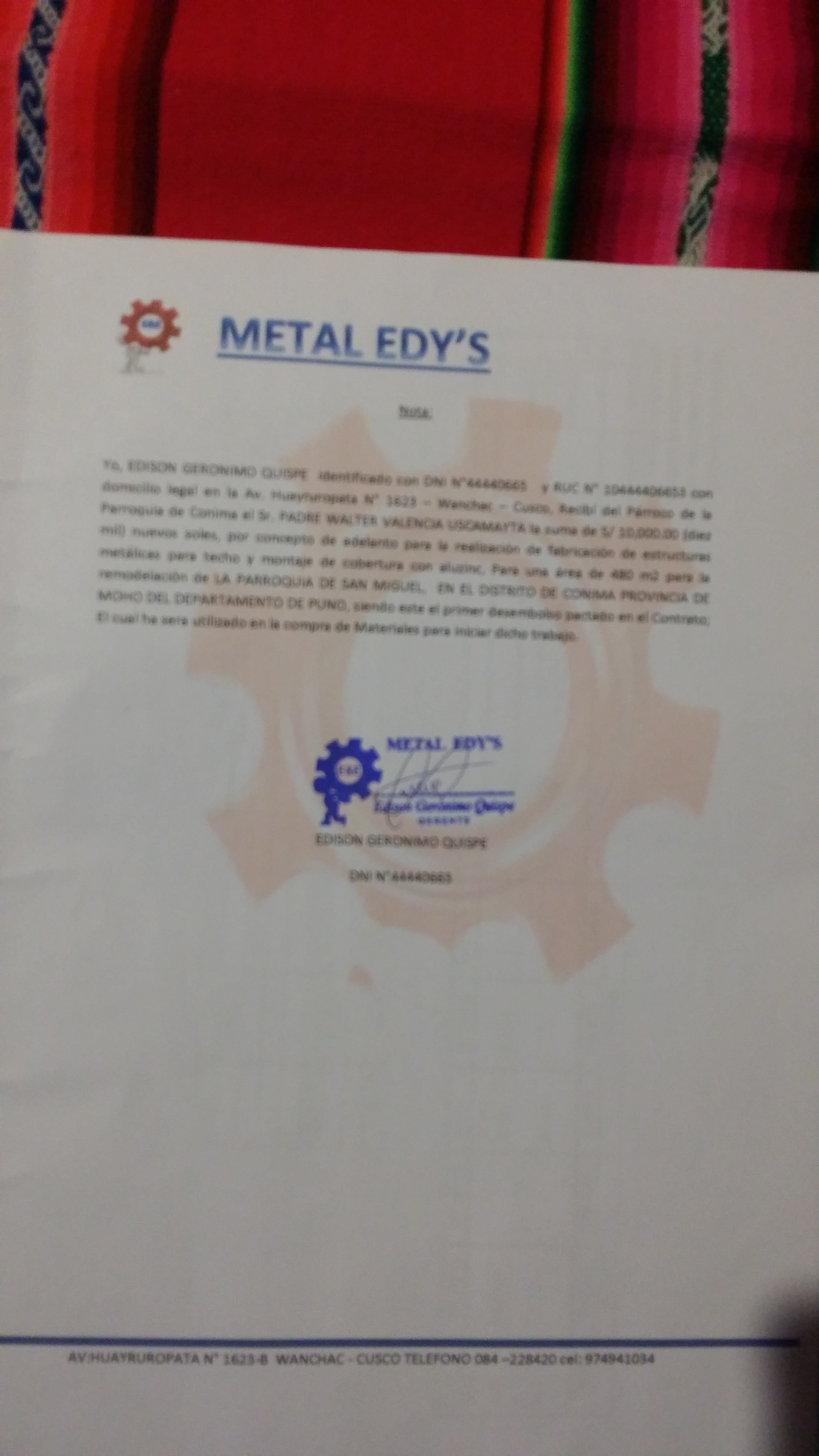 IN DATA 5 GENNAIO 2016 IL VICARIO GENERALE DI JULI HA INVIATO ACCUSA DI RICEVIMENTO DEL DENARO RICEVUTO IL 23 DICEMBRE 2016