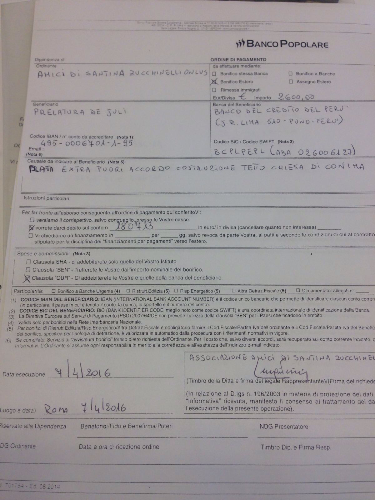 Valutata la Lettera, il Comitato Direttivo decide di inviare l’aggiunta di Euro 2600 in data 7 aprile 2016 con la seguente causale di Bonifico e la lettera di accompagnamento dell’addetto al progetto Dottor Giampietro Teodori che si può leggere qui. Ecco invece copia del bonifico extra versato: