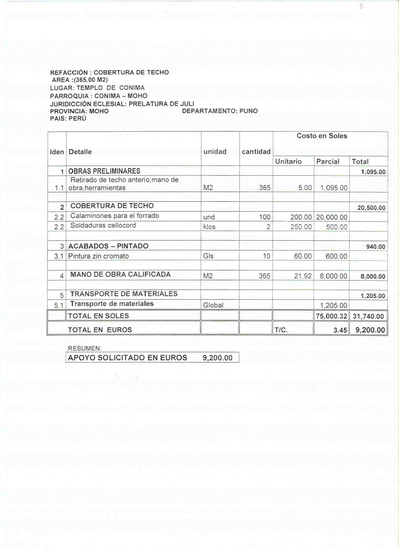 I. PROGETTO COSTRUZIONE TETTO CHIESA DI SAN MICHELE ARCANGELO IN CONIMA (PRELATURA DI JULI, PERU’) SOSTENUTO DALL’ASSOCIAZIONE AMICI DI SANTINA ZUCCHINELLI (ROMA, 21 LUGLIO 2015)