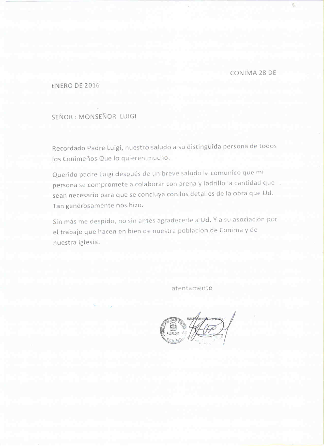 Así mismo quiero expresarle mis agradecimientos en nombre el pueblo de Conima, del medio Urbano y rural de nuestra Parroquia, por hacer posible esta ayuda. Unidos en la Oración Atentamente en Cristo. Pbro. Dr. Irineo Fernando Samaniego Orellana