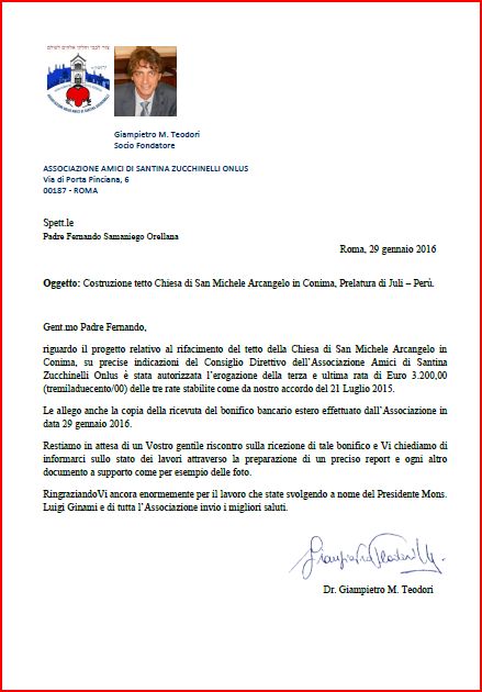 Avvenuto il versamento, su incarico del Presidente, il Dottor Giampietro Teodori provvedeva ad inviare lettera al Vicario Generale di Juli comprovante il pagamento della prima rata documentandolo con bonifico allegato
