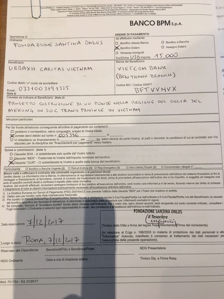 Dopo alcuni mesi di trattative sulle concrete modalità del progetto ci è giunta finalmente una Sua cortese lettera che ci dice la possibilità di realizzare un ponte nella Diocesi di Can Tho. Sono lieto di CONFERMARE quanto già deliberato  in data 12 settembre 2016 dal Consiglio di Amministrazione, riunito nella Sede di Roma della nostra Fondazione. Il Consiglio di Amministrazione  all’unanimità in data 12 giugno 2017 ribadisce di stanziare l’intera somma da Voi richiesta per un totale di 15.000 Dollari, con l’assicurazione che il piccolo ponte dovrà essere ultimato entro il 31 dicembre 2017.