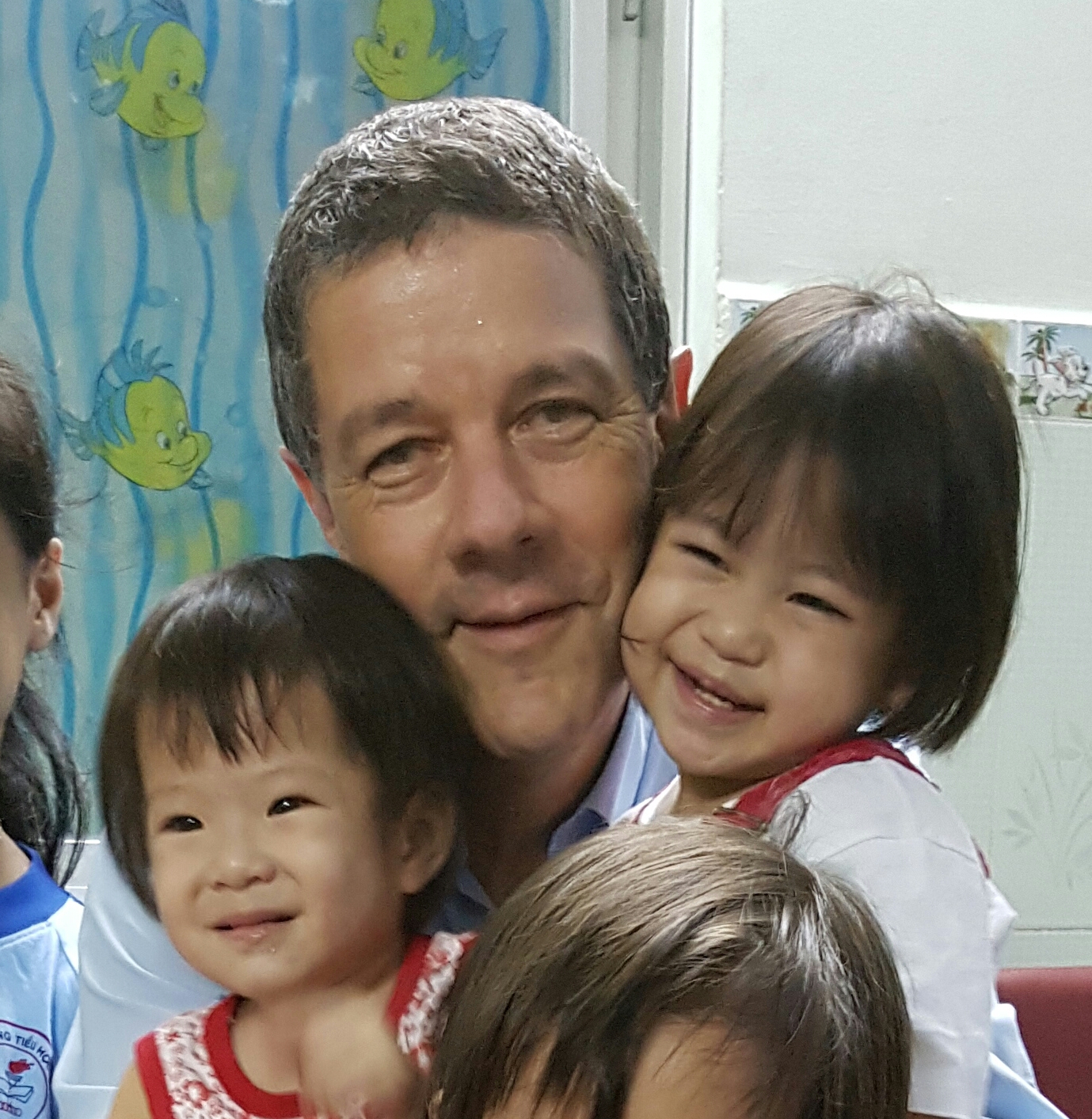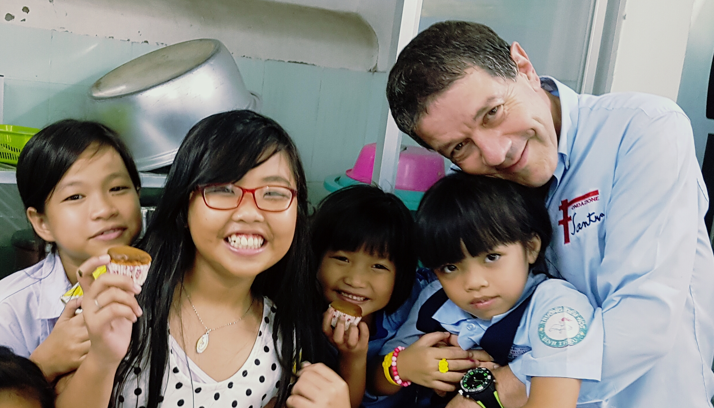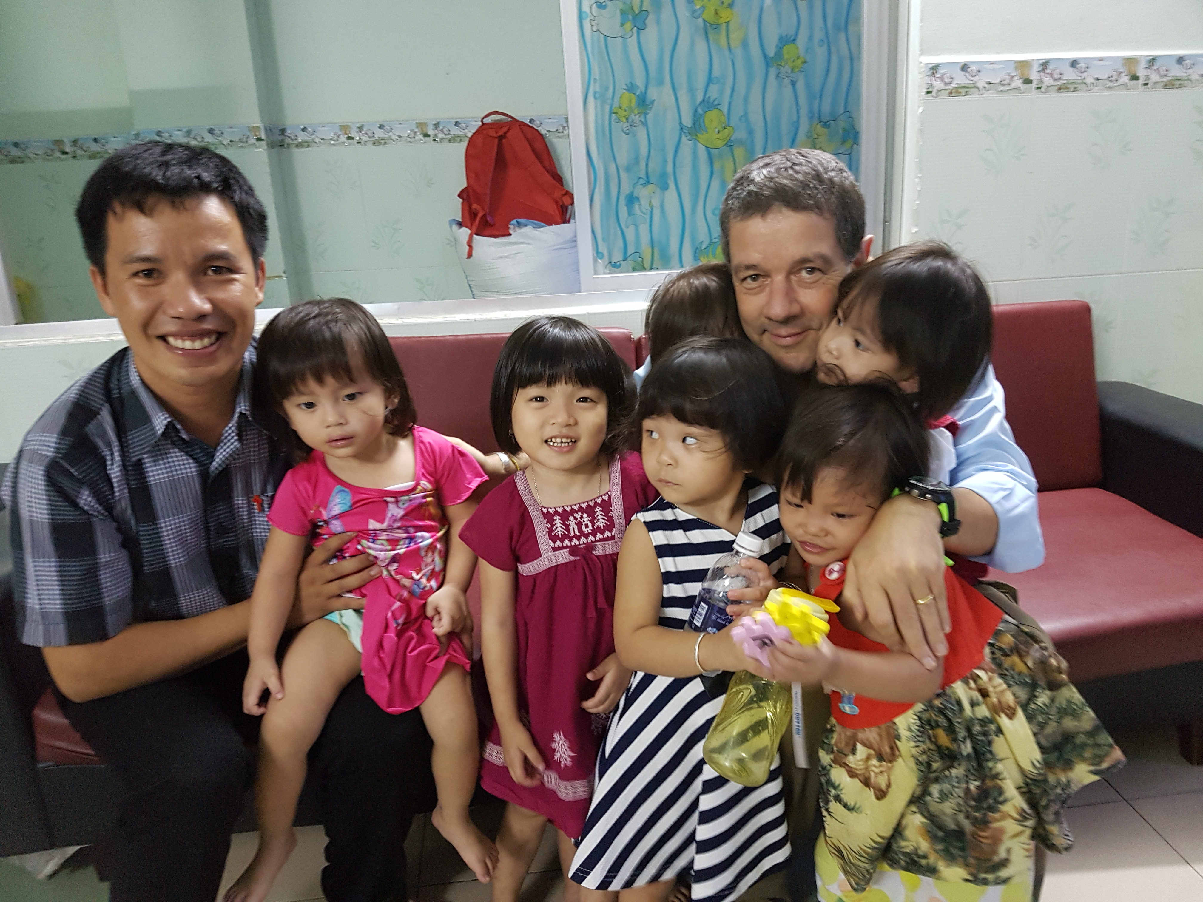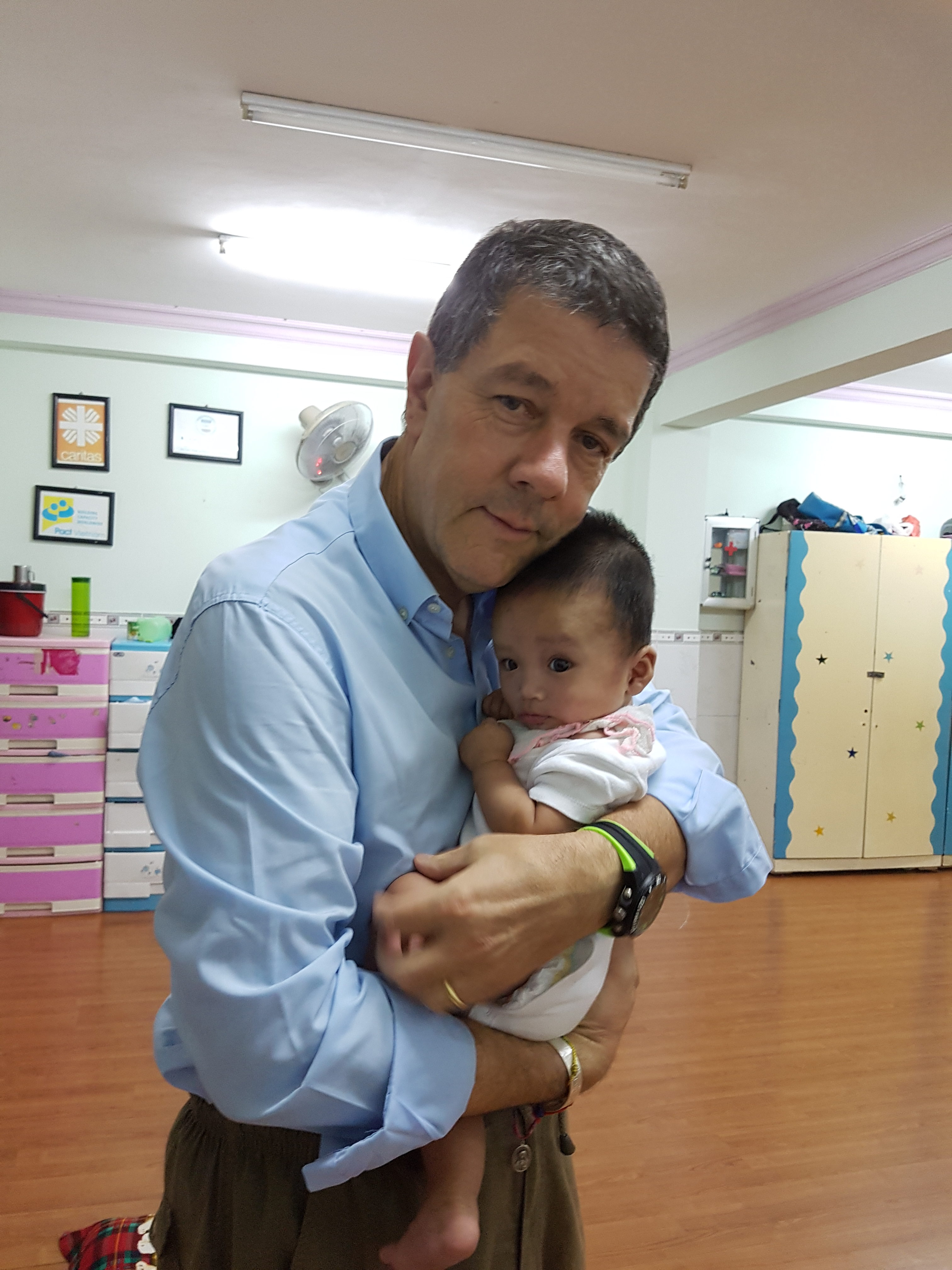 La guardo è dolcissima e mi chiedo quale sia la colpa per questa malattia troppo comune in Vietnam! La bimba di nome Maria non si scompone, i suoi occhietti buoni e furbi propri dell’innocenza che fa trasparire ogni sentimento, guarda i miei piedi con le calze bianche, guarda i miei scarponcini da trekking e non ha dubbio sceglie gli scarponcini. Deve essere attratta dal color verde delle rifiniture e delle stringhe e così ha inizio un nuovo gioco: prende tra le manine piccole la calzatura e si diverte a sfilare le stringhe…. Giunge un’altra piccolina della stessa età, con un biberon pieno di acqua, e questa decide invece audacemente di saltarmi subito tra le braccia ed una volta in braccio mi ficca in bocca il biberon e mi costringe a bere. Bevo due sorsi e poi vedo Maria che sta tirando i miei pantaloni, vuole anche lei stare in braccio e per catturare la mia attenzione mi dà un bacetto sulla mia mano sinistra, vede il grosso orologio verde e cerca di prenderlo, ma capisce che non è semplice. La prendo in braccio e felice mi abbraccia. Queste due bambine in cinque minuti hanno tolto sia stanchezza che preoccupazioni. Giungono tutti gli altri bambini ed a rimettere un po’ di ordine giunge anche Padre Anthony. Mi saluta con un abbraccio e mi mette subito a mio agio. Parlo a lui del nostro lavoro in Kenya con i malati HIV e lui mi descrive il bellissimo lavoro che svolge.