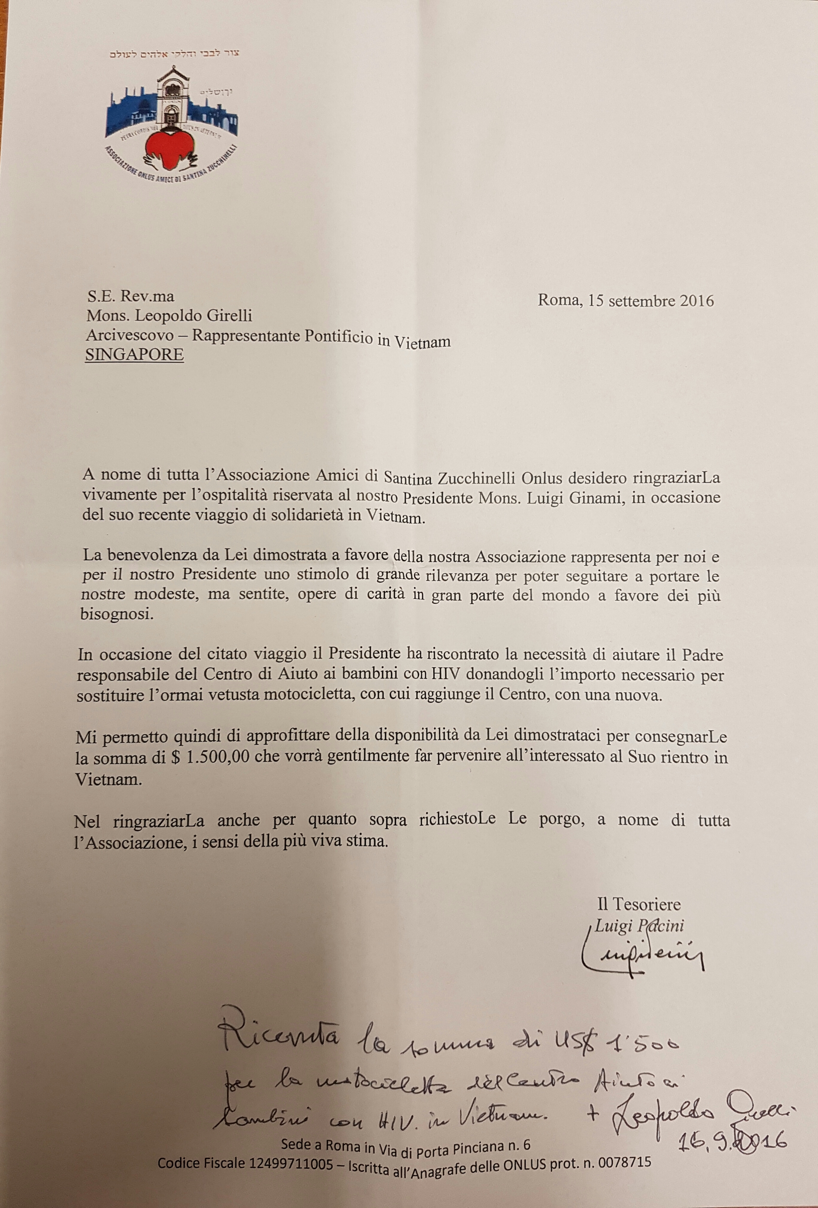 Leggete il seguente brano tolto dal libro Ngo Quan Tuyen, settembre 2016, Edito da Fondazione Santina (euro 5) e riguardante il viaggio di solidarietà in Vietnam dal 2 all’11 settembre 2016 pp 83-94. Al termine della visita al centro che cura HIV vediamo esigenza di un motorino nuovo. Tale proposta viene accolta dal direttivo che stanzia 1500 Dollari per acquisto della moto, come riportato dalla Lettera qui allegata.