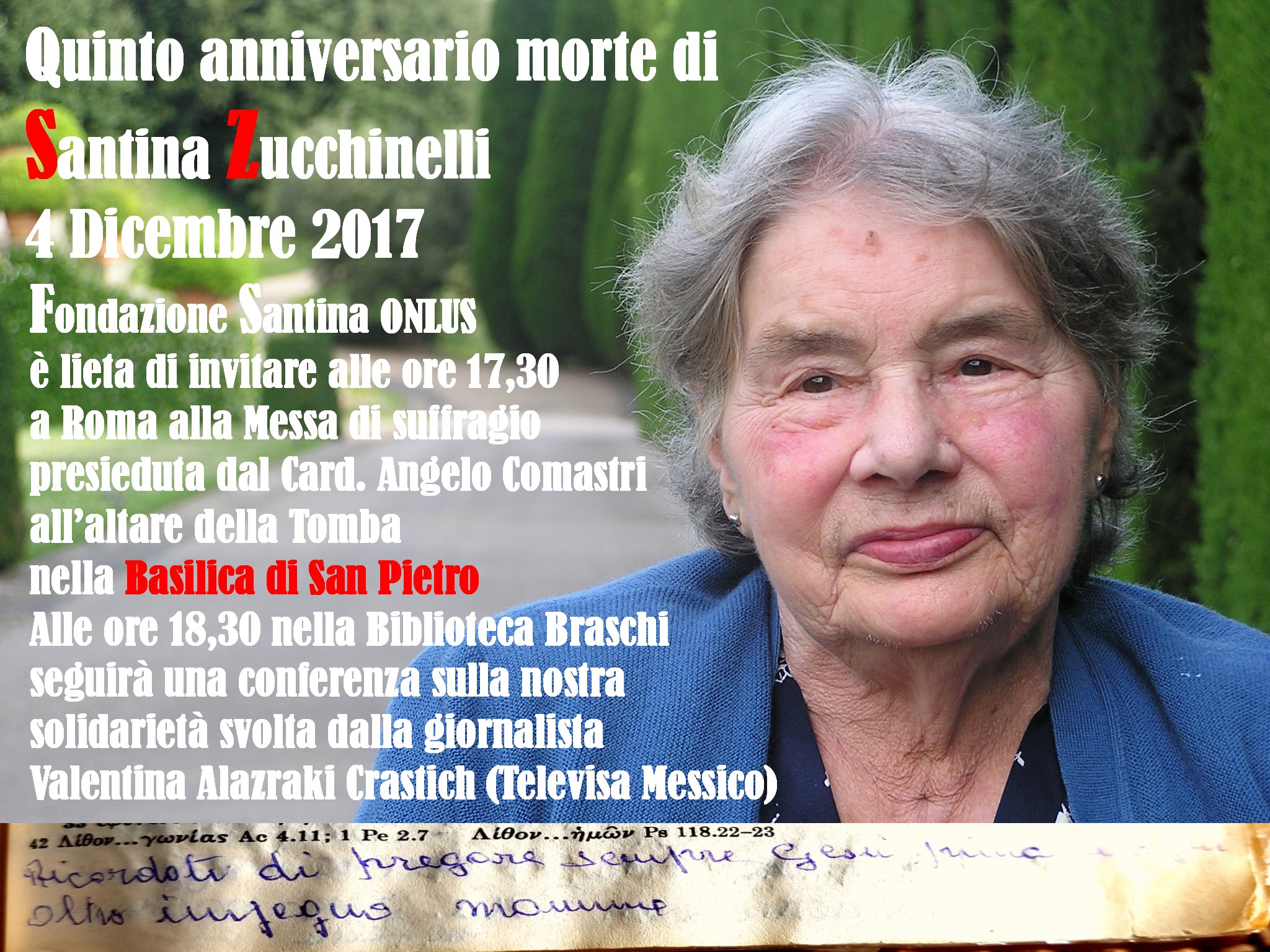 L’anniversario della morte di Santina sarà celebrato nella Basilica di San Pietro a Roma il 4 dicembre 2017. Il Cardinale Angelo Comastri presiederà la Santa Messa di suffragio alle ore 17,30 all’Altare della Tomba. Per entrare in Vaticano dai cancelli del Sant’Ufizio è necessario presentare l’invito qui sotto riportato. Alle ore 18,30 la celebre giornalista Valentina Alazraki Crastich di Televisa Messico svolgerà una conferenza sull’opera di solidarietà svolta dalla nostra Associazione e dalla Nostra Fondazione.