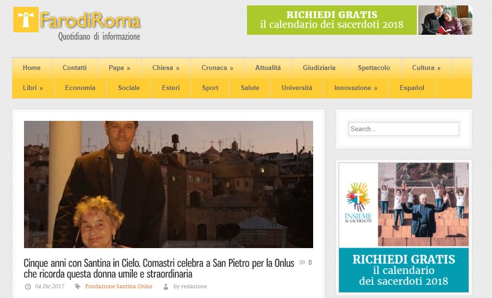 Non mancate dunque all’anniversario! E per quelli che proprio non possono venire? Non è semplice scappare dalla mia proposta. Ti organizzi… Quale è la chiesa più vicina a casa? A che ora dicono la Messa? Bene: allora quel giorno mi organizzo e vado comunque in chiesa a pregare per la mia Associazione, per le nostre opere di solidarietà per i terremotati del Messico, per gli alluvionati del Perù, per i malati di AIDS del Kenya o del Vietnam, per i profughi di Iraq e di Siria che assistiamo, per i nostri bimbi in adozione a distanza. Coraggio: dimmi di sì e mantieni la parola, segnati subito in rosso sulla tua agenda e sul tuo calendario: lunedì 4 dicembre ore 17,30 Basilica di San Pietro, altare della Tomba. Abbiamo tutto il tempo per organizzare i nostri impegni, non ti ho scritto questa lettera una settimana prima e non è neppure la newsletter della nostra bravissima Franca, ma è una lettera apposta per il 4 dicembre 2017, quinto anniversario morte di Santina.
