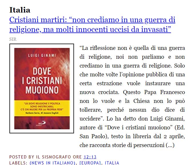 (Luis Badilla – ©copyright) “Dove i cristiani muoiono” è il titolo del libro, edizioni San Paolo, di don Luigi Ginami in libreria da pochi giorni. Nulla di enciclopedico su un argomento sempre all’ordine del giorno, delicato e doloroso. Ciò che attira subito di questa nuova fatica editoriale di don Ginami, autore di numerosi altri libri, sono le “storie di vita”, il racconto, la narrazione; ciò che emerge con forza da questa lettura sono le voci dei protagonisti di questi racconti, potersi quasi immaginare i loro occhi, il gesticolare delle mani di chi ti parla, il sospiro di dolore che si fanno sfuggire nel rievocare le loro testimonianze di sangue versato.