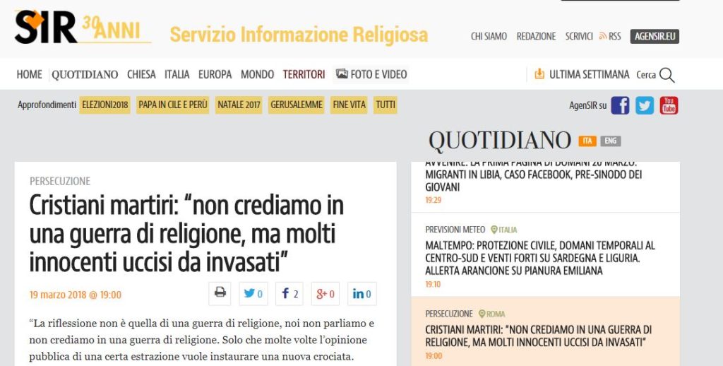 CRISTIANI MARTIRI: “NON CREDIAMO IN UNA GUERRA DI RELIGIONE, MA MOLTI INNOCENTI UCCISI DA INVASATI” (SIR DEL 19.03.18)