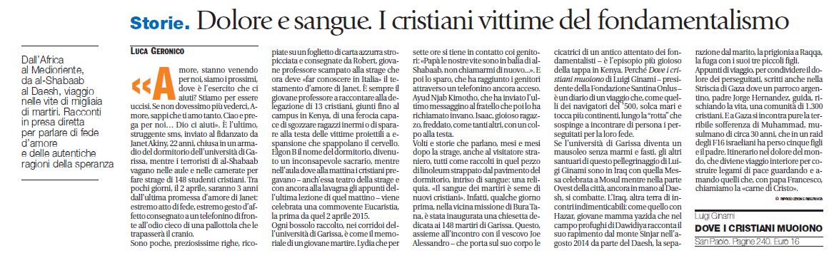A tre anni dalla massacro di Garissa, avvenuto il 2 aprile 2015 in Kenia e costato la vita a 148 studenti cristiani uccisi il giorno del Giovedì Santo in un college universitario da un commando islamista legato ad Al Shabaab, un libro («Dove i cristiani muoiono», edizioni San Paolo, scritto da Luigi Ginami) ripercorre quei momenti mettendo in luce come le violenze contro i cristiani siano in costante aumento. Anno dopo anno.