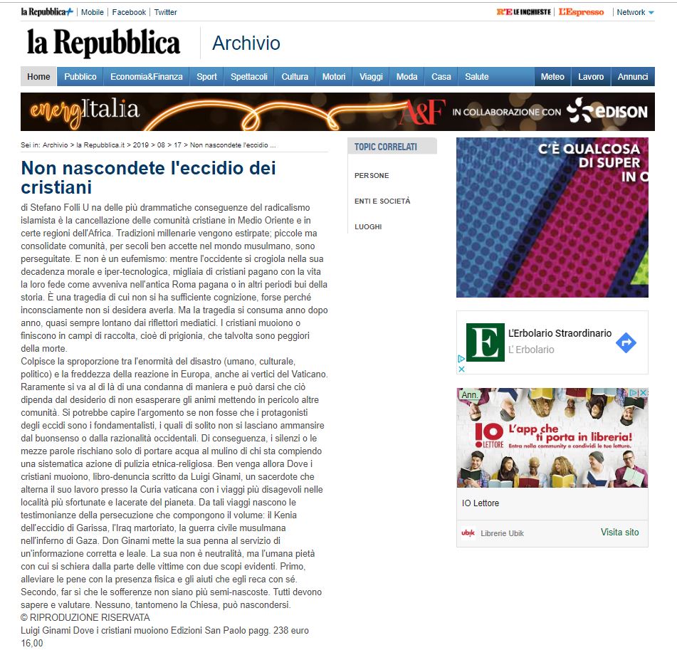 Colpisce la sproporzione tra l’enormità del disastro (umano, culturale, politico) e la freddezza della reazione in Europa, anche ai vertici del Vaticano. Raramente si va al di là di una condanna di maniera e può darsi che ciò dipenda dal desiderio di non esasperare gli animi mettendo in pericolo altre comunità. Si potrebbe capire l’argomento se non fosse che i protagonisti degli eccidi sono i fondamentalisti, i quali di solito non si lasciano ammansire dal buonsenso o dalla razionalità occidentali. Di conseguenza, i silenzi o le mezze parole rischiano solo di portare acqua al mulino di chi sta compiendo una sistematica azione di pulizia etnica-religiosa. Ben venga allora Dove i cristiani muoiono, libro-denuncia scritto da Luigi Ginami, un sacerdote che alterna il suo lavoro presso la Curia vaticana con i viaggi più disagevoli nelle località più sfortunate e lacerate del pianeta. Da tali viaggi nascono le testimonianze della persecuzione che compongono il volume: il Kenya dell’eccidio di Garissa, l’Iraq martoriato, la guerra civile musulmana nell’inferno di Gaza. Don Ginami mette la sua penna al servizio di un’informazione corretta e leale. La sua non è neutralità, ma l’umana pietà con cui si schiera dalla parte delle vittime con due scopi evidenti. Primo, alleviare le pene con la presenza fisica e gli aiuti che egli reca con sé. Secondo, far sì che le sofferenze non siano più semi-nascoste. Tutti devono sapere e valutare. Nessuno, tantomeno la Chiesa, può nascondersi.