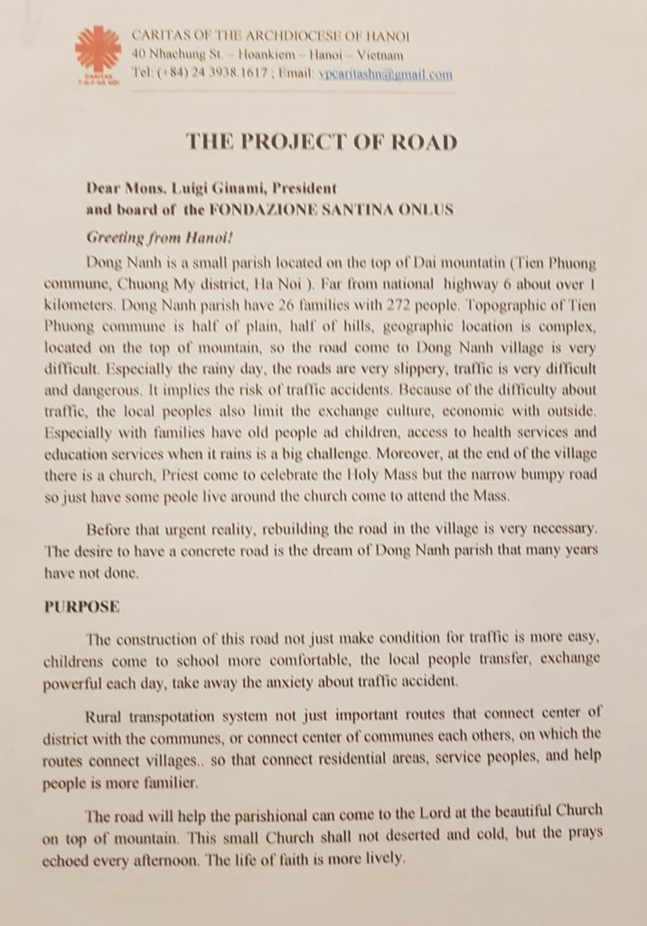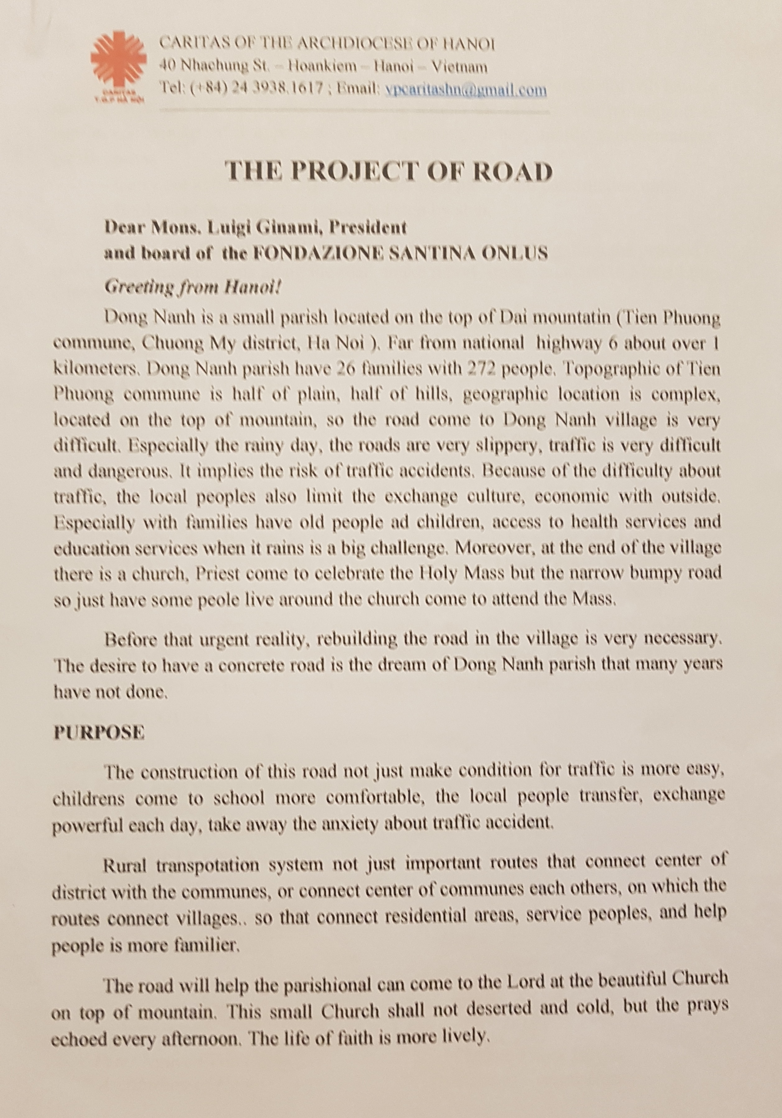 Hà Nội 8/8/2018 Caro Don Luigi Ginami e i Membri dell’Assemblea Associazione ONLUS Amici di Santina Zucchinelli. Sono Padre Bruno, Direttore della Caritas dell’arcidiocesi di Hanoi. Prima di tutto vorrei inviare gli auguri di salute e auguro ogni benedizione del Signore a voi. Nel nome dei poveri, sono contentissimo di scrivere questa lettera di ringraziarvi per quanto ho ricevuto da voi. Particolare questa volta abbiamo ricevuto 12.000 EURO per costruire una strada a Dong Nanh. La strada è compiuta e sta aspettando voi a inuagurarla. Noi non possiamo fare niente per voi ma Dio effonderà abbondanza i suoi beni per voi e vostra famiglia, perché Egli ha detto: “Chi avrà dissetato anche con un solo bicchiere d’acqua fresca uno di questi piccoli, in quanto discepolo, in verità vi dico: non perderà la sua ricompensa” (Mt 10,42). Ancora una volta Vi ringazio e prego che Dio benedica voi e vostra famiglia. In Cristo Bruno Phạm Bá Quế