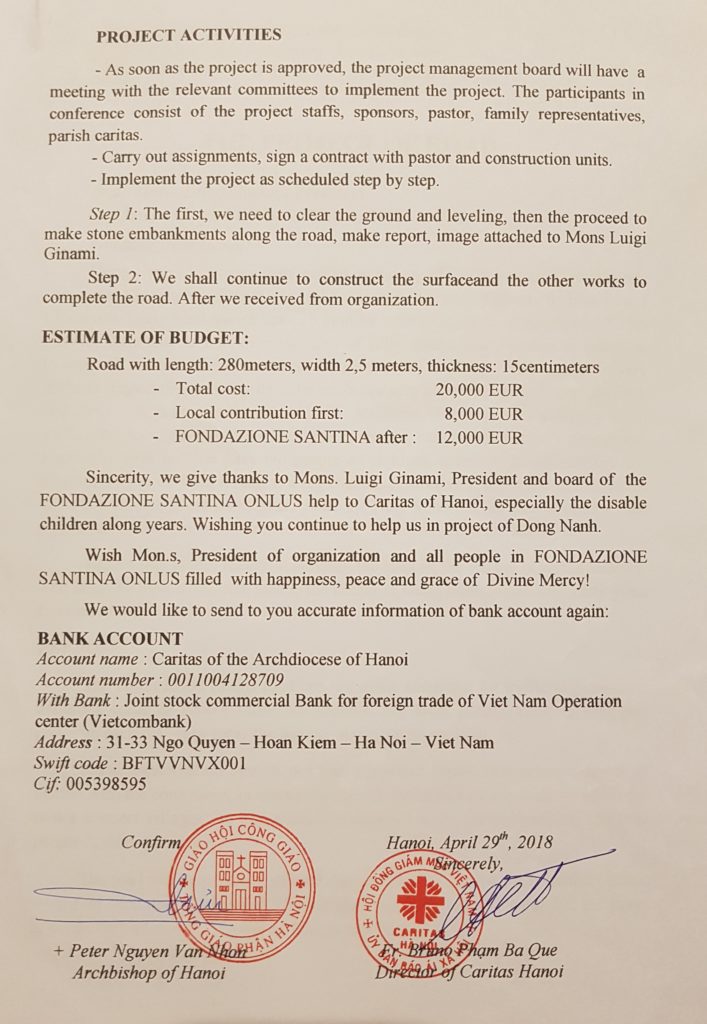 Lettera di richiesta di costruzione della strada a firma del Cardinale di Hanoi e del Direttore della Caritas