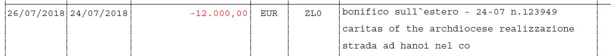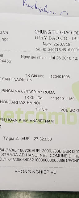 Dear Mons. Luigi Ginami Greetings from Hanoi! We are glad to welcome you on 13 August in Ha Noi. I am so please send to you some vouchers relating to the amount of money that you sent to about the road making in Dong Nanh sub – parish. 12,000 EUR 26/07/2018 4516 – 0004456 12,000.00 //Ref:03MT180726125584{//}VAL:180726EUR12000, /33B:EUR12000, /Tlx:SW1807262934 /Pmnt:REALI ZZAZIONE STRADA AD HANOI NEL COMUNE DI TIEN PHUONG PER IL TOTALEDI EUR 12000,00 /71A:OUR /B.O:/IT04V05034032100000000053861/FONDAZIONE SANTINA ONLUS Thank you very much. Sincerely yours, Sr. Mary Pham Thi Thu Trang Secretary of Hanoi Caritas