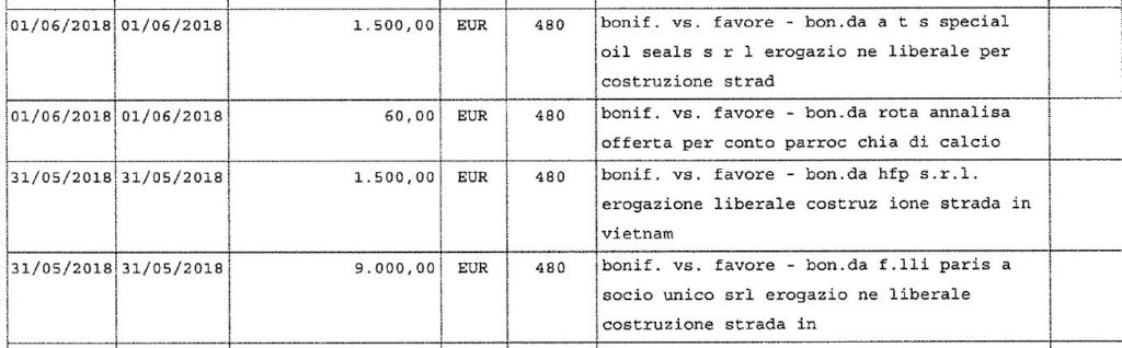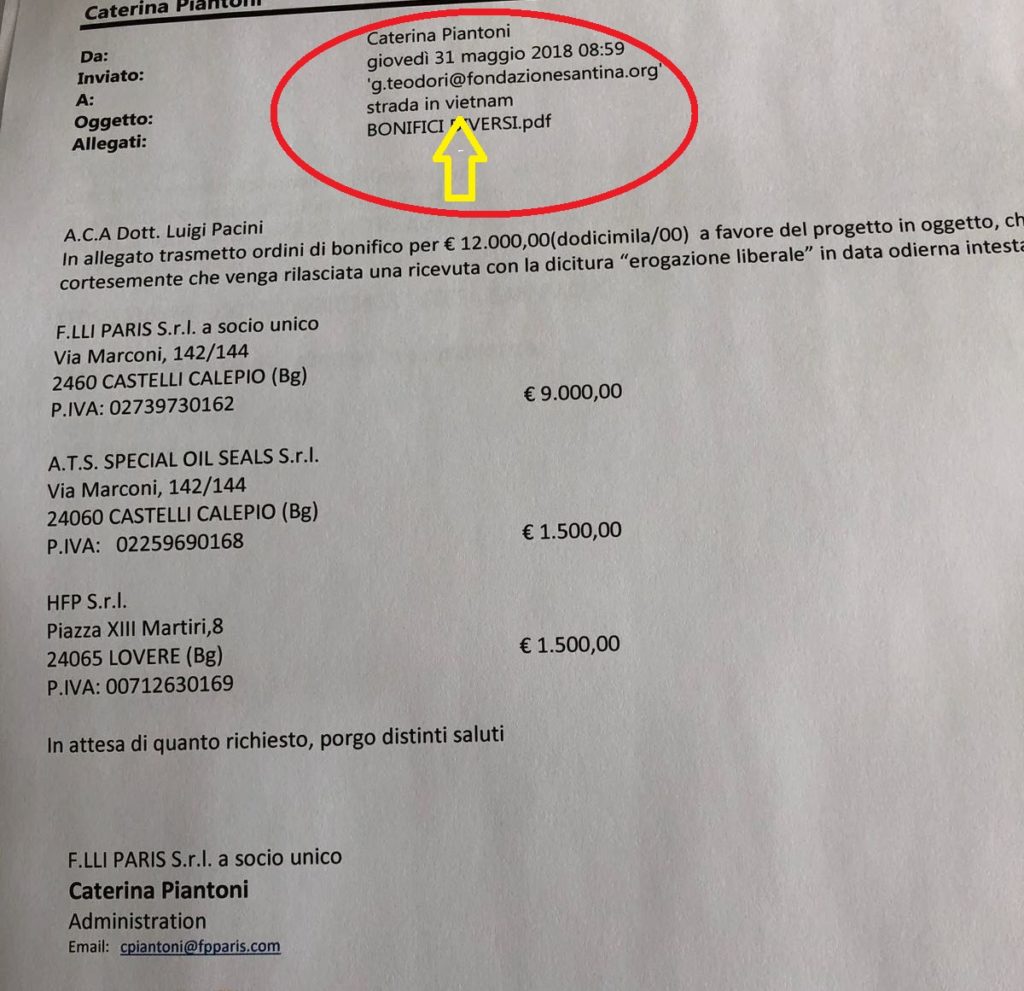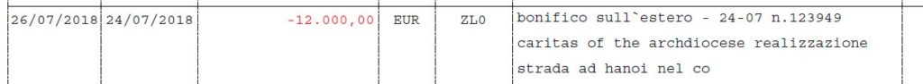 Ecco il bonifico di Euro 12.000 erogato sul progetto della strada in data 31 maggio 2018, giorno della festa della Visitazione di Maria alla cugina Elisabetta