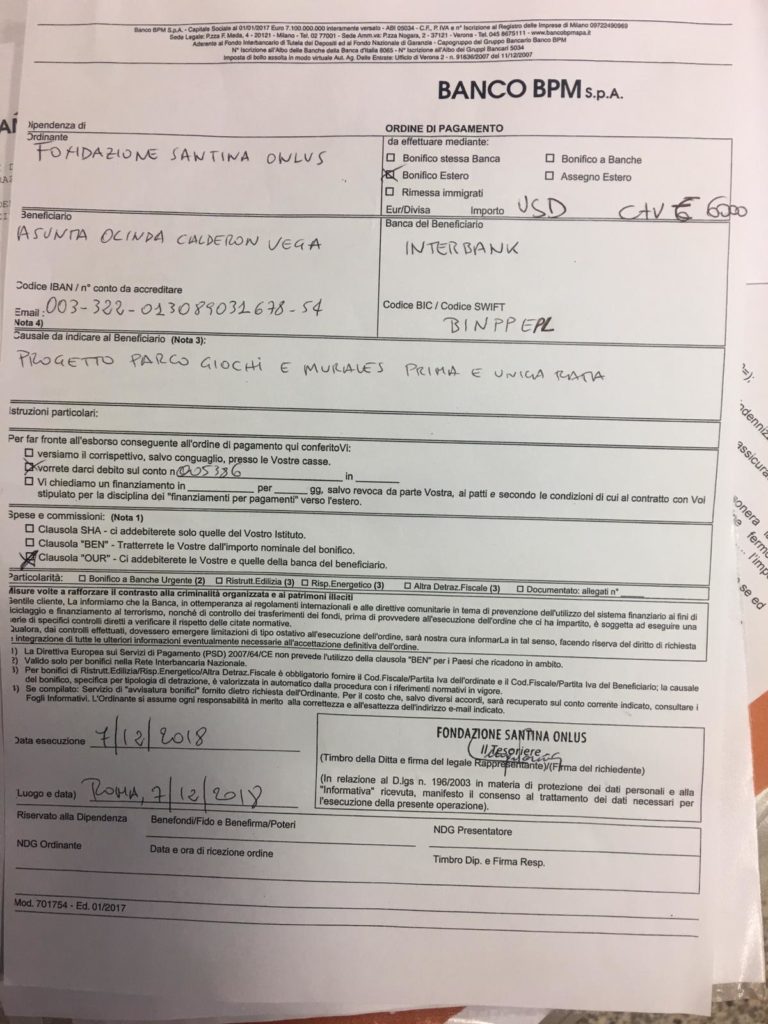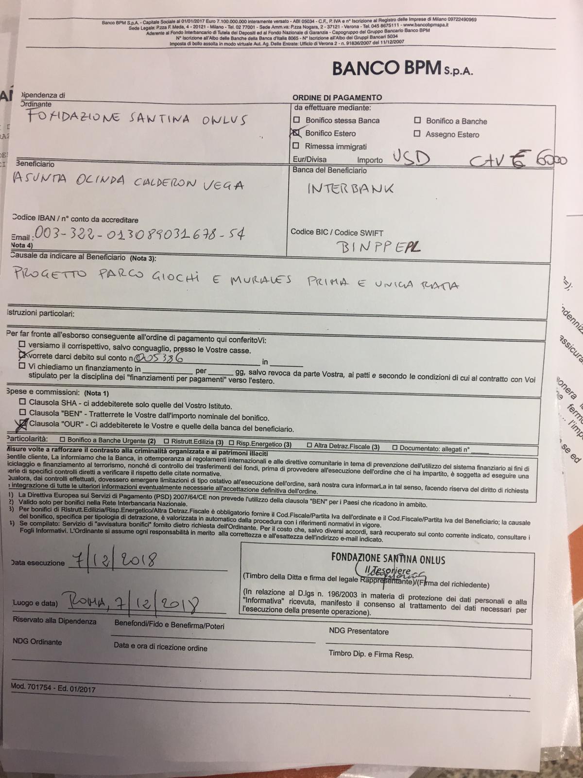 Nei giorni seguenti la Direttrice ci restituisce il protocollo controfirmato, che potete vedere qui. In seguito a tale risposta, il Dottor Luigi Pacini, Tesoriere di Fondazione Santina ONLUS, provvede in data 7 dicembre 2018 ad erogare Euro 6000 in un controvalore in dollari. Ecco qui di seguito riportata l’ordine di Bonifico.