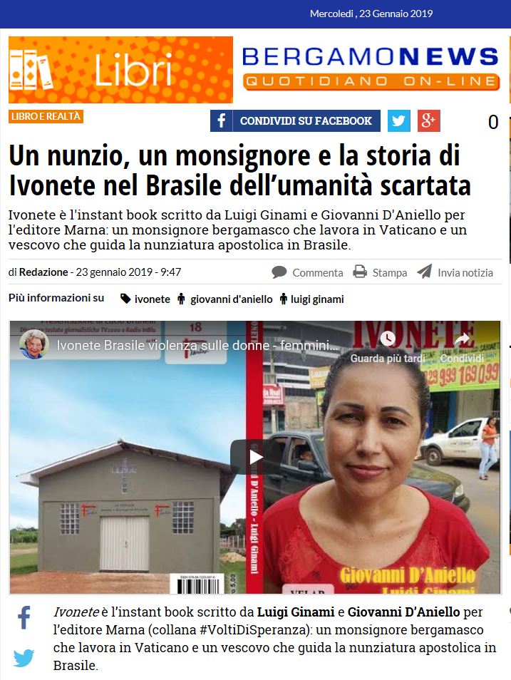 “Il mare, diceva Santa Teresa di Calcutta, è fatto di tante piccole gocce. Mettiamoci anche la nostra, in modo da permettere a Dio, attraverso di noi, di continuare a stupire”. Si conclude con questa consapevolezza, apparentemente semplice, il viaggio nel Brasile dimenticato di monsignor Luigi Ginami e del nunzio Gianni D’Aniello. Due uomini di Chiesa fuori dagli schemi, come sottolinea Lucio Brunelli nella prefazione. Don Gigi, come ama farsi chiamare Ginami, non solo ha creato la Fondazione di solidarietà Santina, dal nome della madre, morta nel 2012. Il sacerdote visita periodicamente i progetti realizzati nel Sud del mondo, per vedere e toccarne con mano le ferite. Stavolta don Gigi ha invitato ad accompagnarlo il nunzio D’Aniello, che non s’è fatto pregare. Dalla loro avventura nell’altra faccia del Gigante latinoamericano è nato l’instant book “Ivonette”, pubblicato dall’Editrice Velar, nella collana Volti di speranza. Maria Ivonete è una donna comune di Brasilia: per tutta la vita si è presa cura di un anziano, a cui è affezionata come una persona di famiglia. Eppure, un tragico giorno, il figlio dell’uomo ha fatto irruzione in casa sua e, in un raptus di follia, l’ha colpita con 18 pugnalate che solo per un soffio non l’hanno uccisa. Le cicatrici, però, percorrono l’intero corpo della donna. “Toccare una cicatrice, vederla, significa partecipare di lei. Loro, le cicatrici sono lì e mi invitano ad entrare dentro, a conoscerle e a farle mie. Diciotto coltellate, diciotto pugnalate che urlano, gridano richiesta di senso, il “perché”, racconta monsignor Ginami. “Perché?”, l’eterna domanda di fronte al male. Invece di arrovellarsi in sterili elucubrazioni, i monsignori Ginami e D’Aniello stanno vicino a chi soffre. A Ivonete come ai disperati della discarica di Vila Princesa di Porto Velho in Rondonia: uomini, donne e bambini costretti a vivere fra la spazzatura. O le quaranta famiglie isolate nel cuore dell’Amazzonia, sulle rive del fiume Madeira. “Abbiamo camminato al fianco del Signore come i due discepoli di Emmaus – scrive monsignor D’Aniello – ignari molte volte di averLo accanto a noi”.