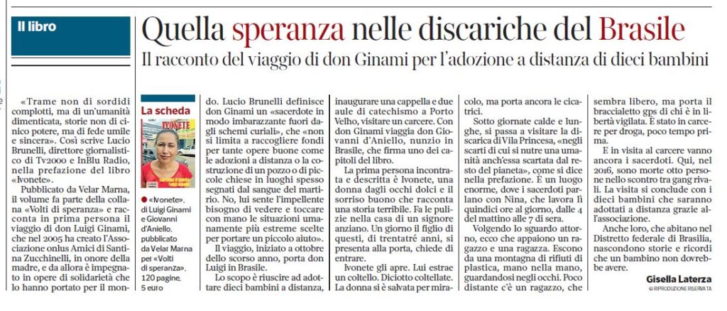 Pubblicato da Velar Marna, il volume fa parte della collana «Volti di speranza» e racconta in prima persona il viaggio di don Luigi Ginami, che nel 2005 ha creato l’Associazione onlus Amici di Santina Zucchinelli, in onore della madre, e da allora è impegnato in opere di solidarietà che lo hanno portato per il mondo. Lucio Brunelli definisce don Ginami un «sacerdote in modo imbarazzante fuori dagli schemi curiali», che «non si limita a raccogliere fondi per tante opere buone come le adozioni a distanza o la costruzione di un pozzo o di piccole chiese in luoghi spesso segnati dal sangue del martirio. No, lui sente l’impellente bisogno di vedere e toccare con mano le situazioni umanamente più estreme scelte per portare un piccolo aiuto». Il viaggio, iniziato a ottobre dello scorso anno, porta don Luigi in Brasile. Lo scopo è riuscire ad adottare dieci bambini a distanza, inaugurare una cappella e due aule di catechismo a Porto Velho, visitare un carcere. Con don Ginami viaggia don Giovanni d’Aniello, nunzio in Brasile, che firma uno dei capitoli del libro.La prima persona incontrata e descritta è Ivonete, una donna dagli occhi dolci e il sorriso buono che racconta una storia terribile. Fa le pulizie nella casa di un signore anziano. Un giorno il figlio di questi, di trentatré anni, si presenta alla porta, chiede di entrare. Ivonete gli apre. Lui estrae un coltello. Diciotto coltellate. La donna si è salvata per miracolo, ma porta ancora le cicatrici. Sotto giornate calde e lunghe, si passa a visitare la discarica di Vila Princesa, «negli scarti di cui si nutre una umanitàanch’essa scartata dal resto del pianeta», come si dice nella prefazione. È un luogo enorme, dove i sacerdoti parlano con Nina, che lavora lì quindici ore al giorno, dalle 4 del mattino alle 7 di sera. Volgendo lo sguardo attorno, ecco che appaiono un ragazzo e una ragazza. Escono da una montagna di rifiuti di plastica, mano nella mano, guardandosi negli occhi. Poco distante c’è un ragazzo, che sembra libero, ma porta il braccialetto gps di chi è in libertà vigilata. È stato in carcere per droga, poco tempo prima. E in visita al carcere vanno ancora i sacerdoti. Qui, nel 2016, sono morte otto persone nello scontro tra gang rivali. La visita si conclude con i dieci bambini che saranno adottati a distanza grazie all’associazione. Anche loro, che abitano nel Distretto federale di Brasilia, nascondono storie e ricordi che un bambino non dovrebbe avere.