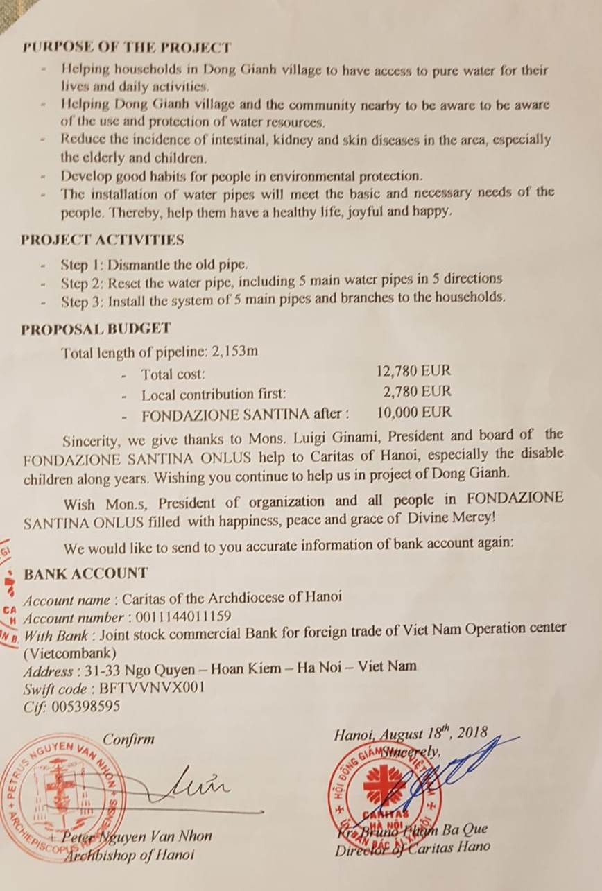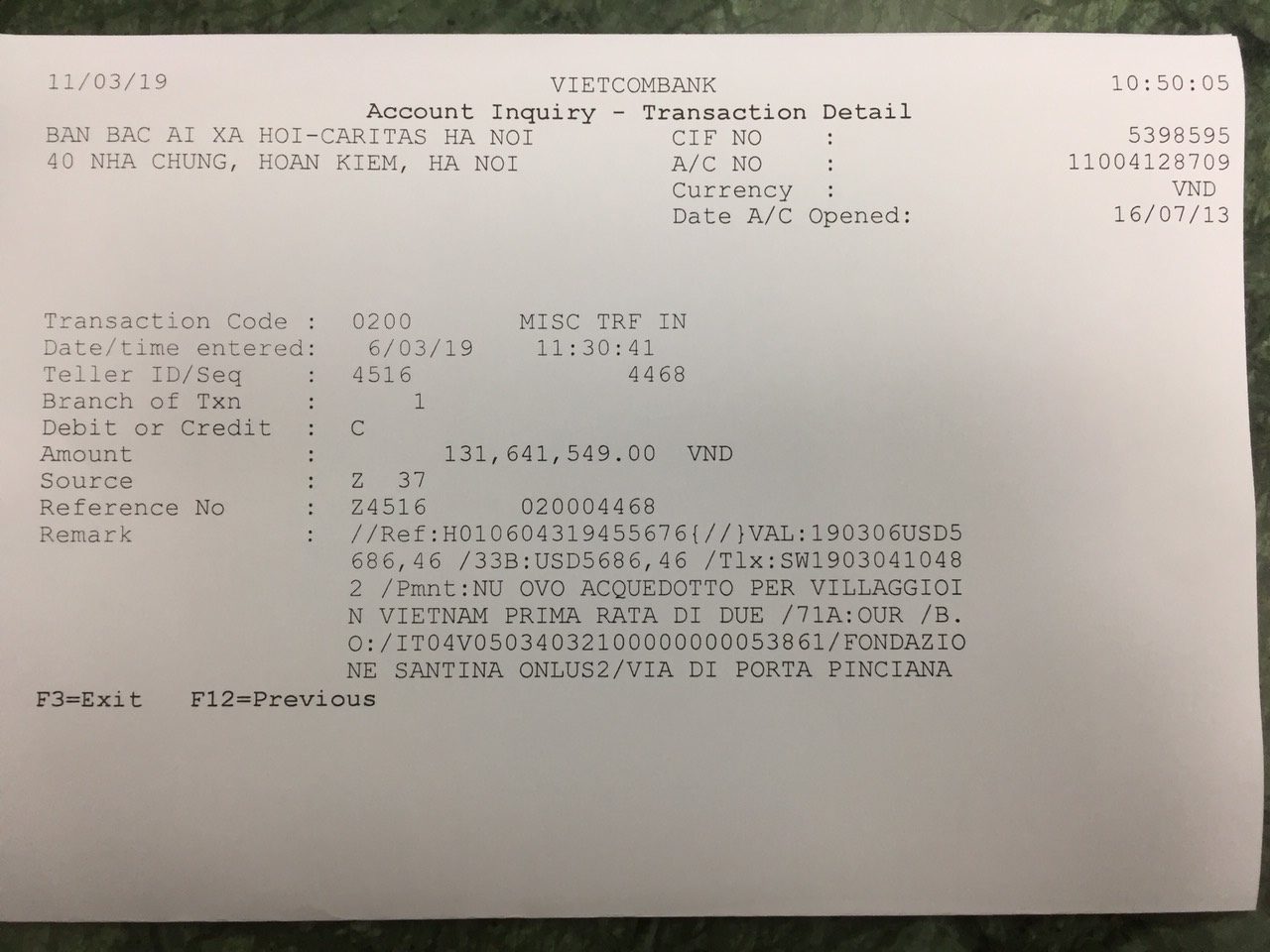 Dopo aver inviato la prima parte di denaro da Hanoi ci raggiunge la ricevuta della Caritas dell’Arcidiocesi che testimonia che il denaro è arrivato a buon fine e presto inizierà il progetto. Ecco la ricevuta che qui riportiamo. Il denaro è giunto ad Hanoi il 6 Marzo 2019