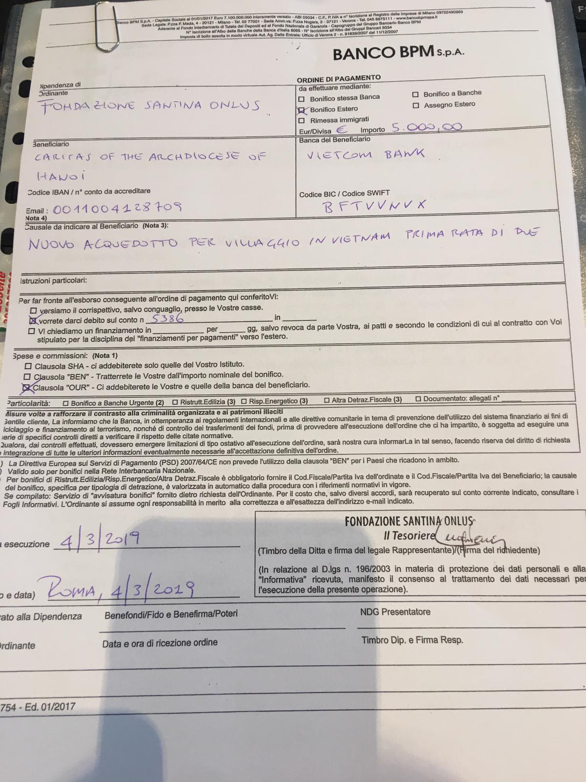 Il nostro tesoriere, il Dottor Luigi Pacini, ricevuta la lettera da parte della Caritas di Hanoi ha provveduto in data ad effettuare il prmo versamento di euro 5000 come si può vedere dall’ordine di bonifico qui riprodotto.