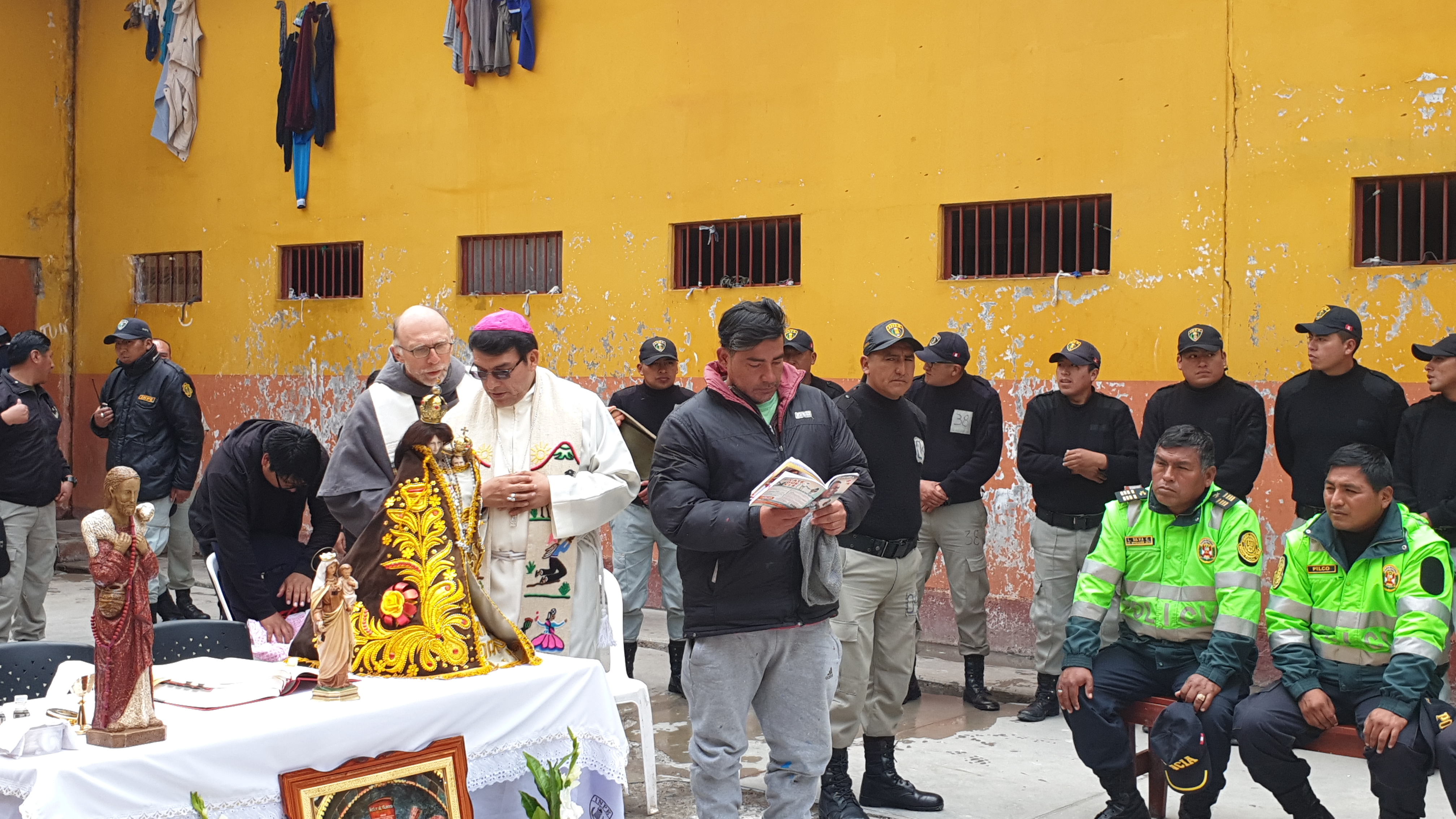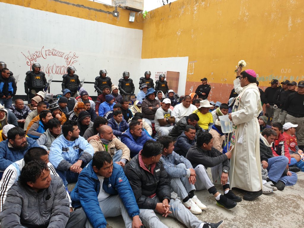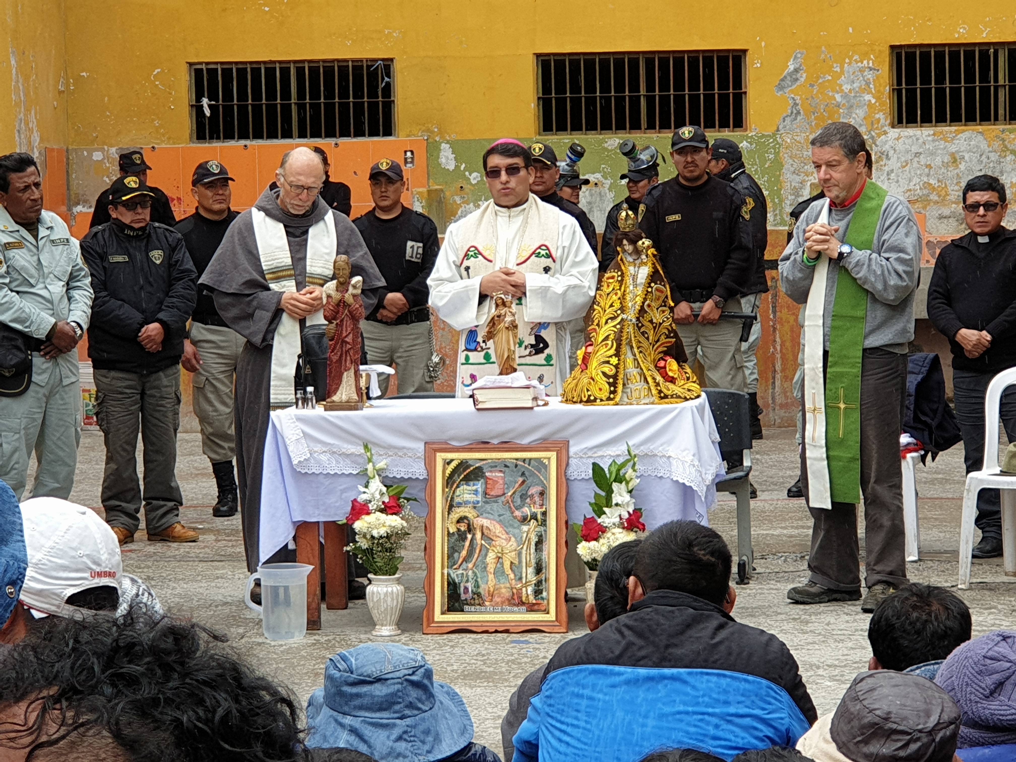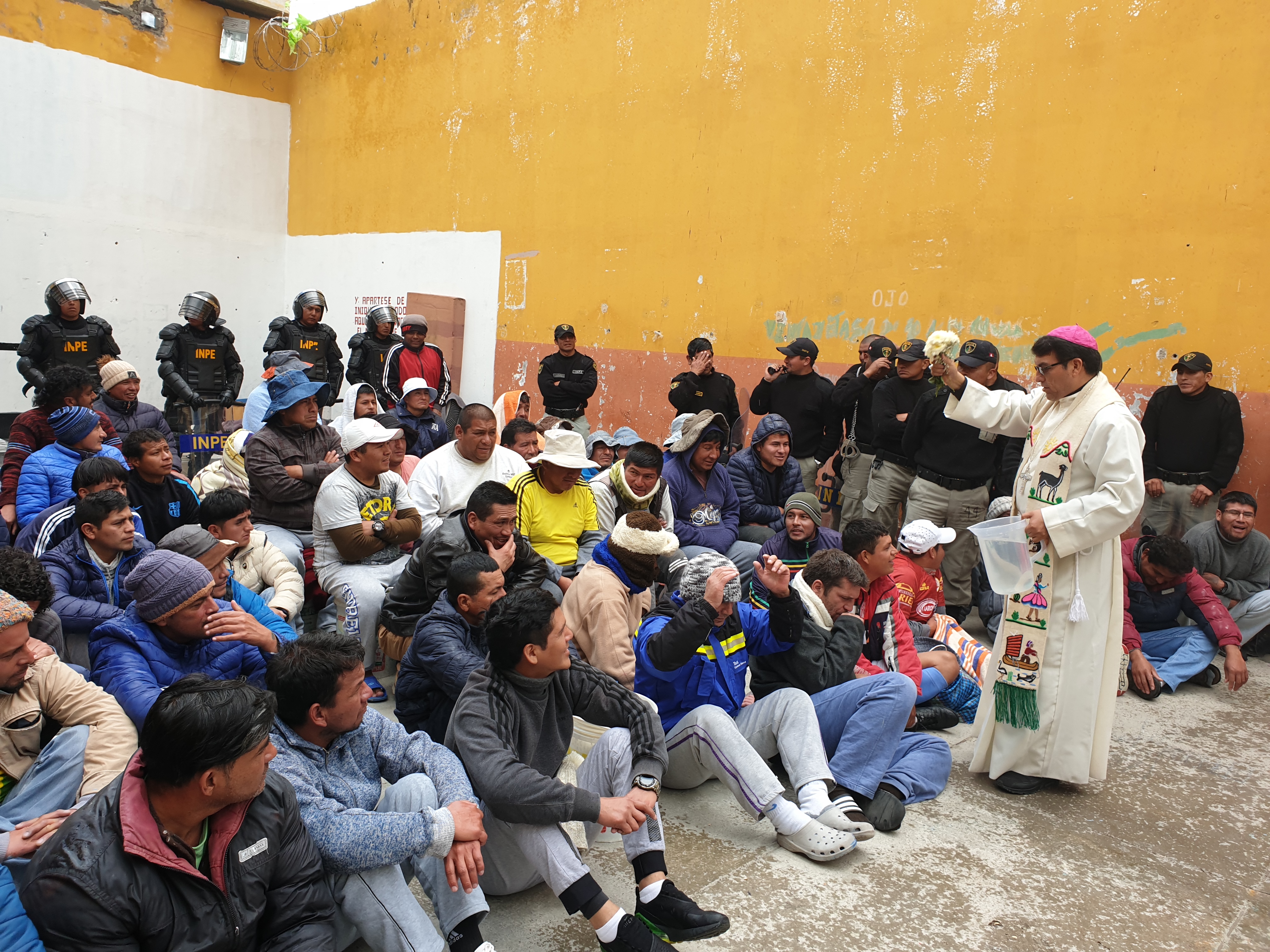 Contaba que nos acogieron muy bien uniformados, los militares, la policía y el personal del INPE. Y luego de los controles respectivos, en uno de los patios principales ya nos esperaban sentados la mitad de los presos. Junto con nosotros entró un buen número de militares, muy bien armados que rodearon a los presos y además observé que en el tejado del edificio había dos franco-tiradores. Nos advirtieron mantener no solo la calma sino también la distancia. “Ellos le pueden capturar y tomarlo por rehén”, me advirtió el personal del INPE. “Y no es broma. Lo hicieron hace un mes”. Obvio que el susto emerge en todo tu cuerpo. Alistamos la pequeña mesa para el altar e improvisamos algunos cantos con un par de mujeres del INPE que conocían cantos religiosos. Fue mi primera misa como obispo en una cárcel y mi primera misa concelebrada con un curial romano. Celebré la misa con un cierto aire de temor y alerta, cuidando la distancia recomendada. Pero a medida que procedía con la celebración mis nervios se relajaban y mi miedo desaparecía. La homilía la hice casi con total desenvoltura porque mirando el rostro de los presos no vi aquel peligro amenazante que lo suponía. Dije que siempre una misa provoca milagros, como el que estaba sucediendo delante de mi vista.
