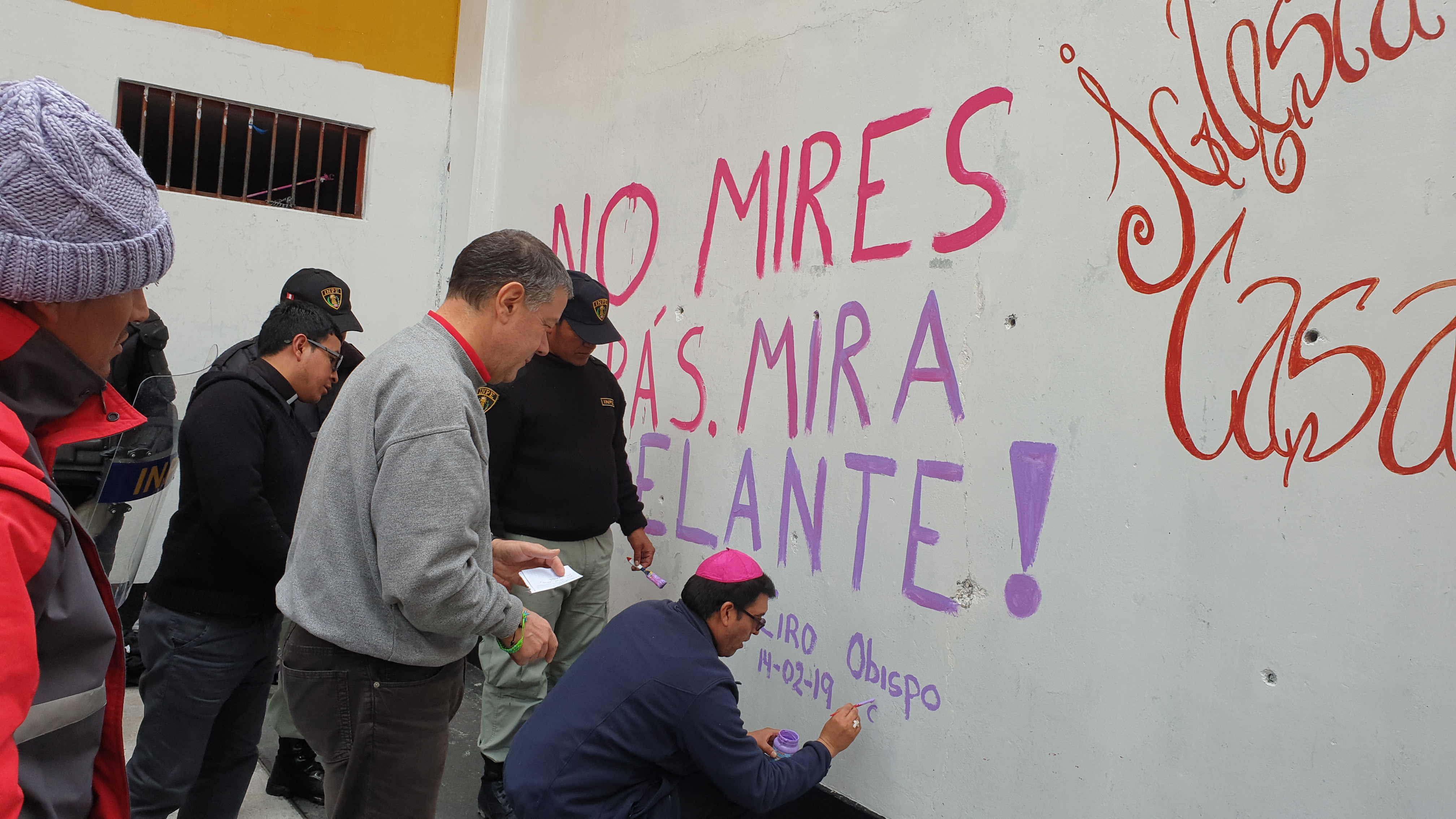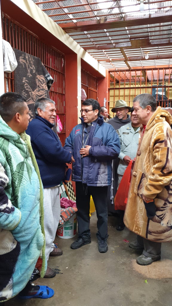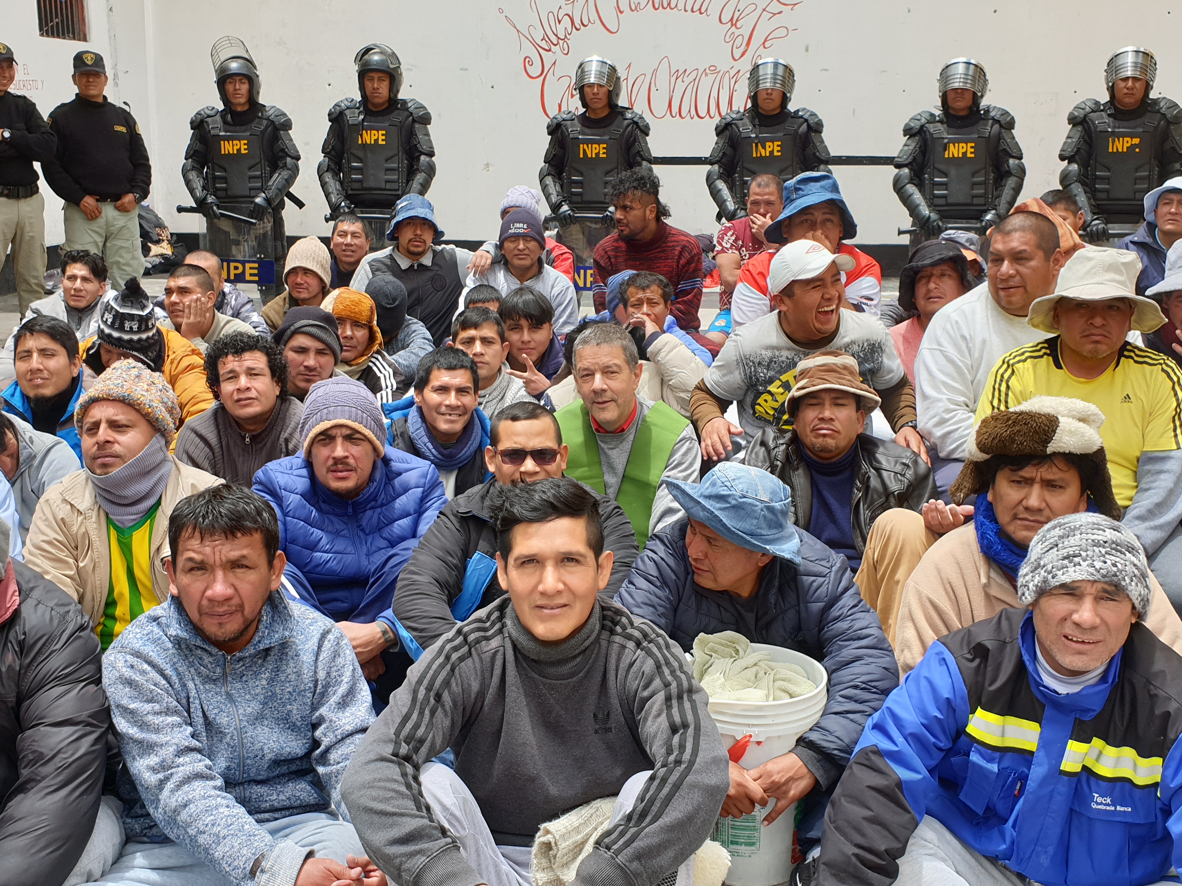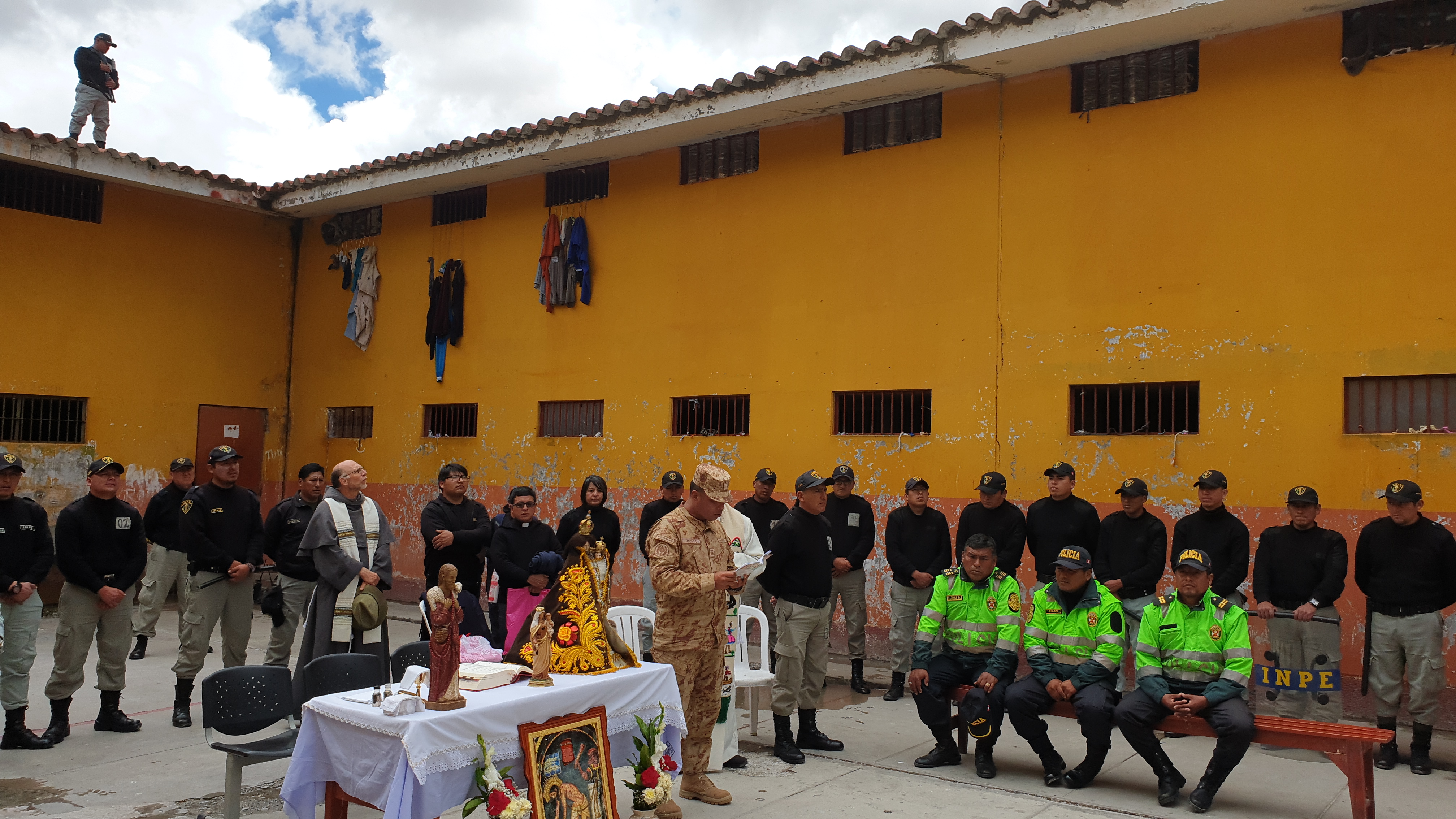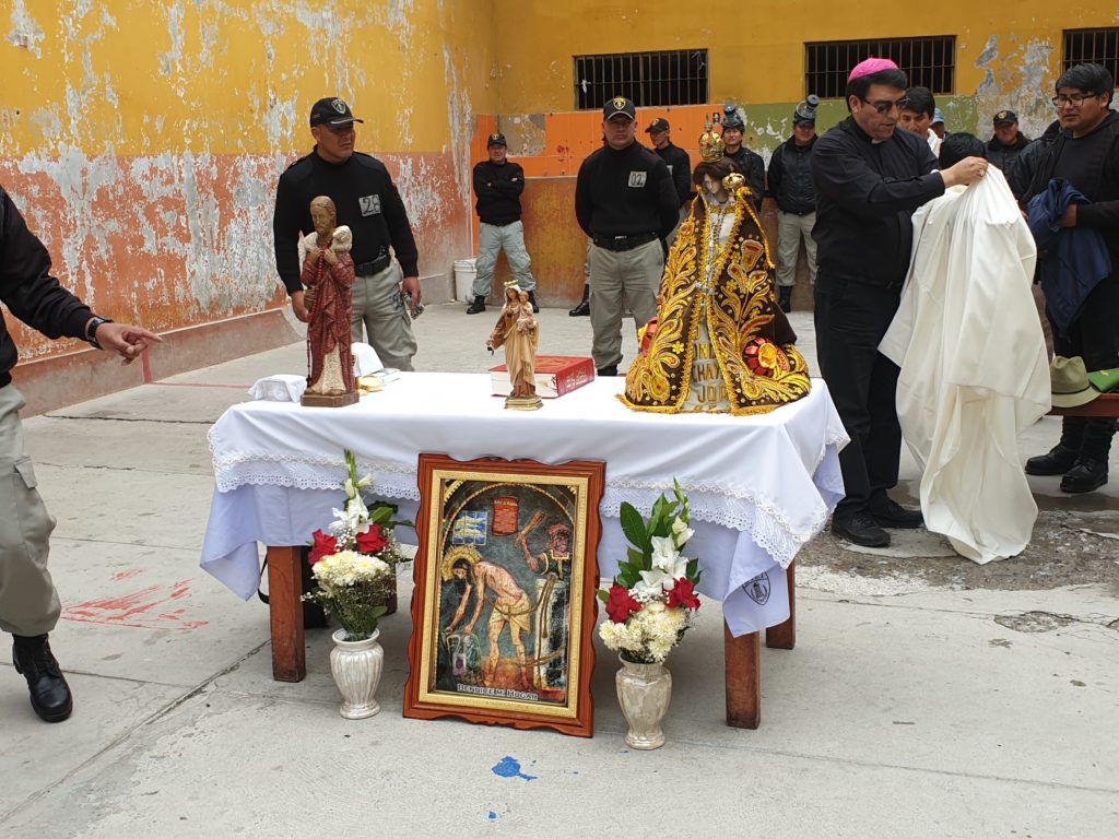 Contaba que nos acogieron muy bien uniformados, los militares, la policía y el personal del INPE. Y luego de los controles respectivos, en uno de los patios principales ya nos esperaban sentados la mitad de los presos. Junto con nosotros entró un buen número de militares, muy bien armados que rodearon a los presos y además observé que en el tejado del edificio había dos franco-tiradores. Nos advirtieron mantener no solo la calma sino también la distancia. “Ellos le pueden capturar y tomarlo por rehén”, me advirtió el personal del INPE. “Y no es broma. Lo hicieron hace un mes”. Obvio que el susto emerge en todo tu cuerpo. Alistamos la pequeña mesa para el altar e improvisamos algunos cantos con un par de mujeres del INPE que conocían cantos religiosos. Fue mi primera misa como obispo en una cárcel y mi primera misa concelebrada con un curial romano. Celebré la misa con un cierto aire de temor y alerta, cuidando la distancia recomendada. Pero a medida que procedía con la celebración mis nervios se relajaban y mi miedo desaparecía. La homilía la hice casi con total desenvoltura porque mirando el rostro de los presos no vi aquel peligro amenazante que lo suponía. Dije que siempre una misa provoca milagros, como el que estaba sucediendo delante de mi vista.