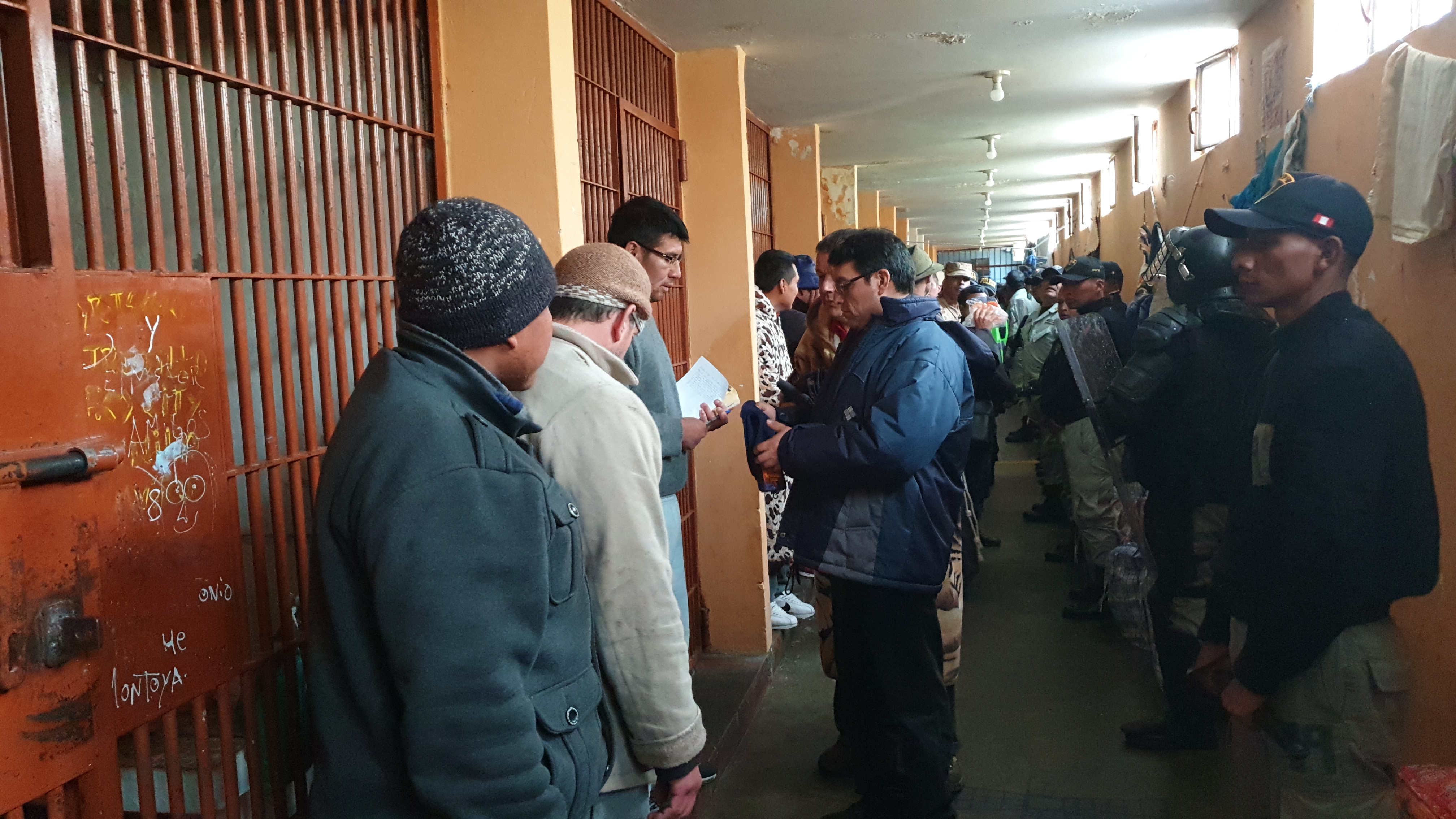 Después de más de 4 horas, divisamos a lo lejos una inmensa estructura de cemento y calamina, pintando también monótonamente. Era la cárcel de Challapalca, en medio de la nada y a orillas de un río cuyo nombre nadie me lo supo explicar y que presumo se llama igual que la cárcel de máxima seguridad. Llegamos en dos camionetas, como lo acabo de mencionar. En la nuestra veníamos además de monseñor Gigi, el padre alemán Vicent… quien es el encargado o el capellán de las cárceles del altiplano que no son pocas (); venía además el padre José Luis que trabaja en la parroquia en la cual nos movilizábamos y un futuro seminaristas quien manejaba la camioneta. En nuestra camioneta, llevábamos asimismo no solo los ornamentos e instrumentos para la misa que celebraríamos en la cárcel junto a los presos sino también un regalo sencillo que no eran sino unos calcetines apropiados para el frío. «Algo es algo», como dijo uno de los internos. Les compré además cuatro pelotas deportivas de futbol y de vóley; dos para los reclusos y dos para las personas encargadas del control. Y en la otra camioneta, iban las autoridades del INPE (Instituto Nacional Penitenciario del Perú) y una familia de amigos de don Luigi. Como todo estaba organizado, como debe ser y es parte del protocolo, nos esperaban a la puerta del ingreso de la cárcel dos filas de militares, que poseen una base junto a la cárcel, miembros de la Policía Nacional del Perú y personal del INPE, quienes tiene la difícil tarea de velar por la paz de este pequeño infierno humano compuesto de 170 internos. Aunque no son demasiados, mantienen en vilo a las autoridades día tras días.