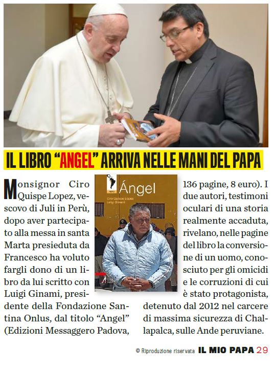 Il 30 aprile mons. Ciro Quispe Lopez, vescovo di Juli in Perù, dopo aver partecipato alla Messa in santa Marta presieduta da papa Francesco, ha voluto fargli dono di un libro da lui scritto con Luigi Ginami, presidente della Fondazione Santina Onlus, dal titolo “Angel” (Edizioni Messaggero Padova, 136 pagine, 8 euro).