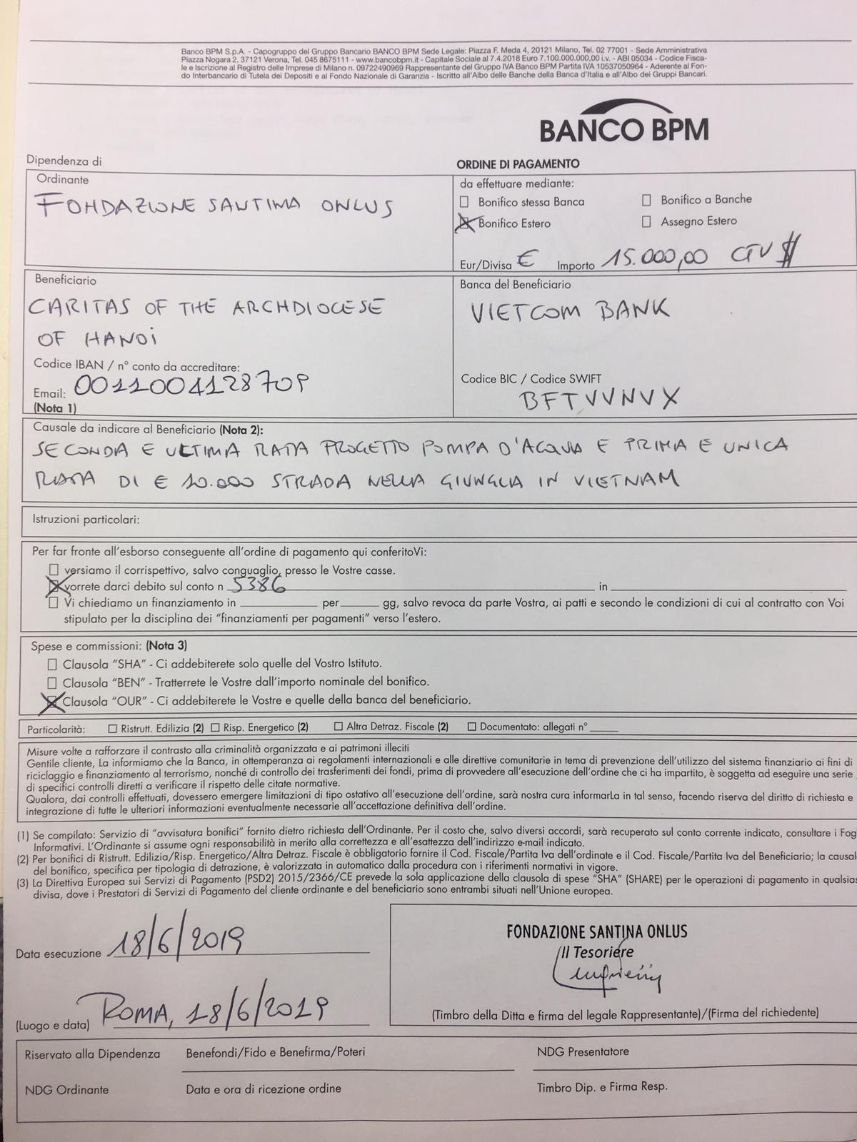In data 18 GIUGNO 2019 è avvenuto l’ invio di denaro per un totale di Euro 15000 in dollari americani, come si può vedere dalla ricevuta qui sotto riportata. Tale denaro comprende anche la seconda rata versata per costruire l’acquedotto che sarà inaugurato nel medesimo viaggio di solidarietà