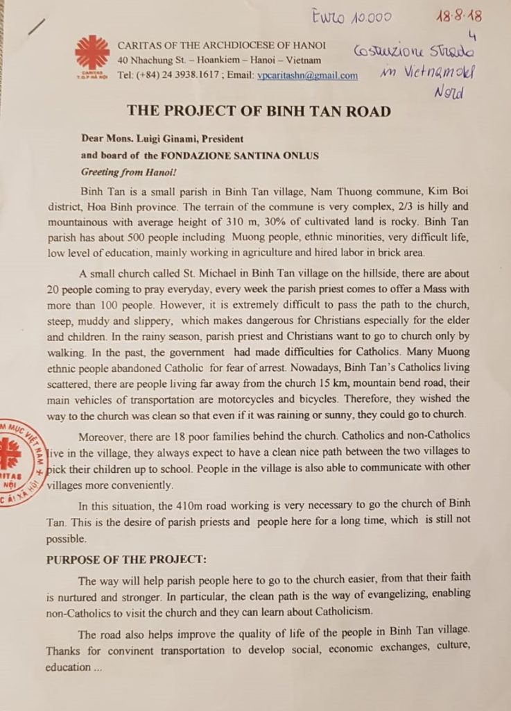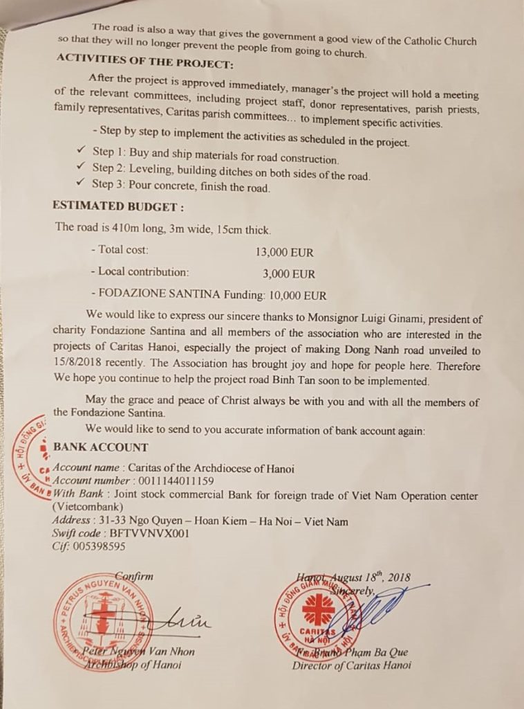 in occasione del recente Viaggio di Solidarietà della nostra Fondazione Santina ONLUS – svoltosi dal 12 al 19 agosto 2018 – è stata formulata al nostro Consiglio di Amministrazione la richiesta di 10.000 Euro per poter realizzare  una strada nella giungla di un villaggio rovinato in Vietnam. Siamo pertanto lieti di confermare che in data  21 gennaio 2019 dal Consiglio di Amministrazione, riunito nella Sede di Roma della nostra Fondazione è stato approvato il progetto per la realizzazione della strada. Il Consiglio di Amministrazione all’unanimità ribadisce di stanziare la somma da Voi richiesta per un totale di 10.000 Euro, con l’assicurazione che la strada dovrà essere ultimata entro la fine dell’anno 2019 Dopo aver fatto queste importanti premesse ecco le condizioni del nostro accordo: